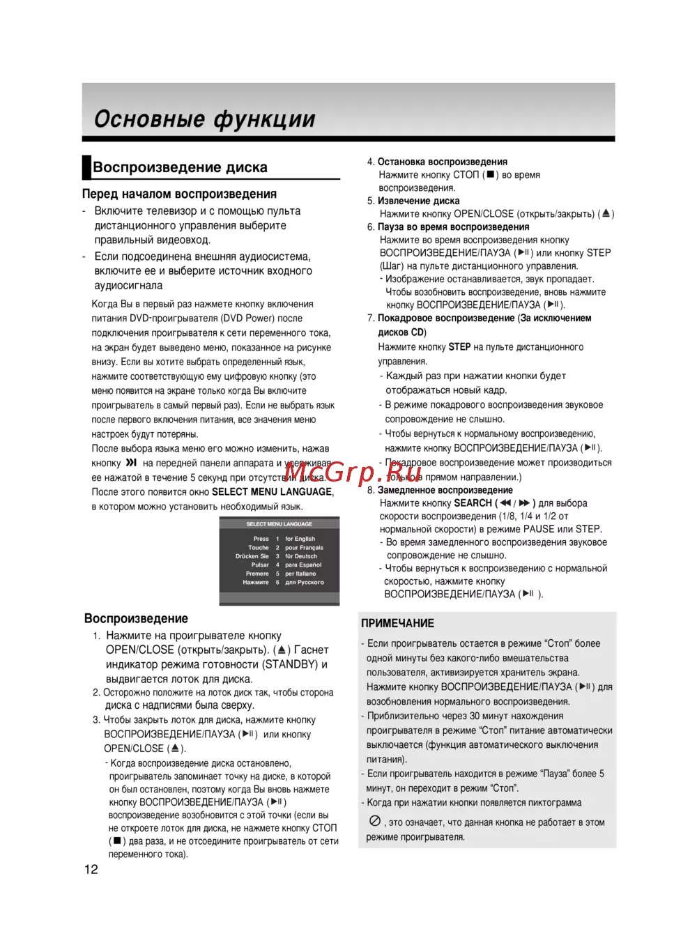 Основные функции 4 Остановка воспроизведения воспроизведение диска Перед началом воспроизведения Включите телевизор и с помощью пульта дистанционного управления выберите Нажмите кнопку СТОП во время воспроизведения 5 Извлечение диска Нажмите кнопку OPEN CLOSE открыть закрыть А 6 Пауза во время воспроизведения правильный видеовход Нажмите во время воспроизведения кнопку Если подсоединена внешняя аудиосистема включите ее и выберите источник входного аудиосигнала Когда Вы в первый раз нажмете кнопку включения питания DVD проигрывателя DVD Power после ВОСПРОИЗВЕДЕНИЕ ПАУЗА И или кнопку STEP Шаг на пульте дистанционного управления Изображение останавливается звук пропадает Чтобы возобновить воспроизведение вновь нажмите кнопку ВОСПРОИЗВЕДЕНИЕ ПАУЗА Hl 7 Покадровое воспроизведение За исключением подключения проигрывателя к сети переменного тока дисков CD на экран будет выведено меню показанное на рисунке Нажмите кнопку STEP на пульте дистанционного внизу Если вы хотите выбрать определенный язык управления нажмите соответствующую ему цифровую кнопку это меню появится на экране только когда Вы включите проигрыватель в самый первый раз Если не выбрать язык после первого включения питания все значения меню отображаться новый кадр В режиме покадрового воспроизведения звуковое сопровождение не слышно Чтобы вернуться к нормальному воспроизведению настроек будут потеряны После выбора языка меню его можно изменить нажав кнопку 1 на передней панели аппарата и удерживая ее нажатой в течение 5 секунд при отсутствии диска После этого появится окно SELECT MENU LANGUAGE в котором можно установить необходимый язык SELECT MENU LANGUAGE Press 1 for Engüsh Touche 2 pour Français Drüdten Se 3 für Deutsch Pulsar 4 para Espehof Premere 5 peritavano Нажмите 6 дпа Русского Воспроизведение 1 Нажмите на проигрывателе кнопку OPEN CLOSE открыть закрыть А Гаснет индикатор режима готовности STANDBY и выдвигается лоток для диска 2 Осторожно положите на лоток диск так чтобы сторона диска с надписями была сверху 3 Чтобы закрыть лоток для диска нажмите кнопку нажмите кнопку ВОСПРОИЗВЕДЕНИЕ ПАУЗА М Покадровое воспроизведение может производиться только в прямом направлении 8 Замедленное воспроизведение Нажмите кнопку SEARCH для выбора скорости воспроизведения 1 8 1 4 и 1 2 от нормальной скорости в режиме PAUSE или STEP Во время замедленного воспроизведения звуковое сопровождение не слышно Чтобы вернуться к воспроизведению с нормальной скоростью нажмите кнопку ВОСПРОИЗВЕДЕНИЕ ПАУЗА ПРИМЕЧАНИЕ Если проигрыватель остается в режиме Стоп более одной минуты без какого либо вмешательства пользователя активизируется хранитель экрана Нажмите кнопку ВОСПРОИЗВЕДЕНИЕ ПАУЗА для возобновления нормального воспроизведения Приблизительно через 30 минут нахождения ВОСПРОИЗВЕДЕНИЕ ПАУЗА М или кнопку проигрывателя в режиме Стоп питание автоматически OPEN CLOSE А выключается функция автоматического выключения Когда воспроизведение диска остановлено проигрыватель запоминает точку на диске в которой он был остановлен поэтому когда Вы вновь нажмете кнопку ВОСПРОИЗВЕДЕНИЕ ПАУЗА воспроизведение возобновится с этой точки если вы не откроете лоток для диска не нажмете кнопку СТОП i два раза и не отсоедините проигрыватель от сети переменного тока 12 Каждый раз при нажатии кнопки будет питания Если проигрыватель находится в режиме Пауза более 5 мин