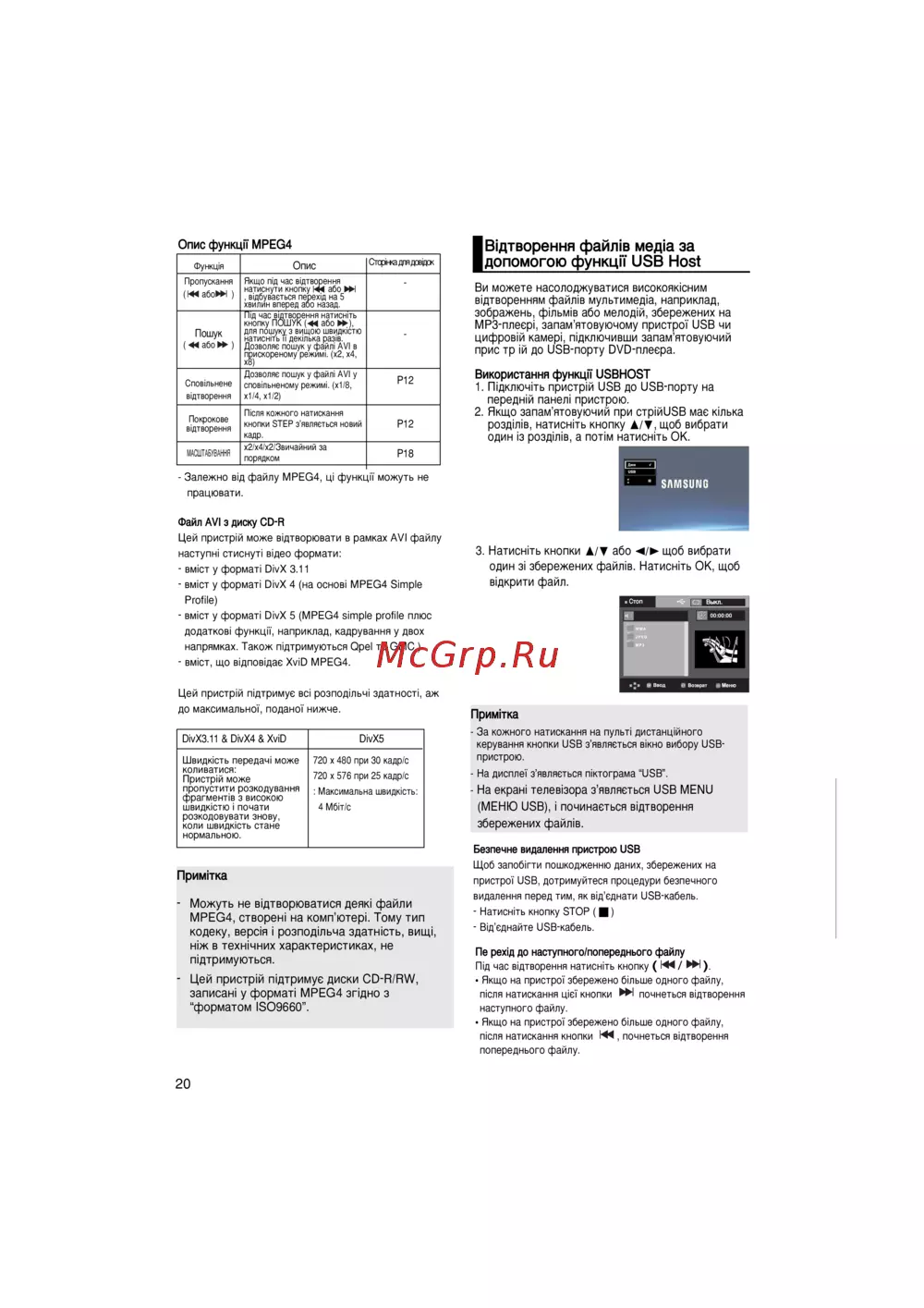 Олис функцп MPEG4 Функщя Пролу скатя М або М Пошук або Скрнад ндада Опис Якщо Шд час вщгвсрення натиснути кнопку к або Ж вщбувасться переяд на 5 хвипин вперед або назад П дчасв1дтворення на гиен ть кнопку ПОШУК 4 або ДЛЯ пбшуку 3 ВИЩОЮ Ш8ИДК1СТЮ натисять и деюлька разе Дозвопяс пошук у фаи ni AVI в л искореному режий х2 х4 Дозвопяс пошук у файл AVI у Спов1льнй е сповпьненому режий х1 8 вкоренил хШ х1 2 Покрокове в д1ворення WLDfWffl П спя кожного натисхажя кнопки STEP з явпясться новий кадр х2х4 х2 3вичаинии за порядком В дтворення файл1в меда за допомогою функц USB Host Ви можете насолоджуватися високояк сним в дтворенням файл в мультимеда наприклад зображень ф льм в або мелодй збережених на МРЗ плеер запам ятовуючому пристроТ USB чи цифров й камер п дключивши запамятовуючий прис тр й до USB порту DVD плеера Р12 Р12 Використання функцп USBHOST 1 П дключ ть пристр й USB до USB порту на передн й панел пристрою 2 Якщо запам ятовуючии при стр йи5В мае к лька розд л в натисн ть кнопку А Т щоб вибрати один з розд л в а пот м натисн ть ОК Р18 Залежно Bi д файлу MPEG4 ц функцп можуть не працювати Файл AVI з диску CD R Цей присгр1й може в дтворювати в рамках AVI файлу 3 Натисн ть кнопки А Т або щоб вибрати наступи стиснут в део формати вм ст у формат DivX 3 11 один з збережених файл в Натисн ть ОК щоб вмют у формат DivX 4 на ocHOBi MPEG4 Simple в дкрити файл Profile BMICT у формат DivX 5 MPEG4 simple profile плюс додатков функцп наприклад кадрування у двох напрямках Також тдтримуються Opel та GMC BMICT що в дпов1дае XviD MPEG4 Цей пристр й тдтримуе вс роэподльч здатност аж до максимально поданоТ нижче Прийтка 720 х 480 при 30 кадр С За кожного натискання на пульт дистанц йного керування кнопки USB з являеться в кно вибору USBпристрою 720 x 576 при 25 кадр С На дисплеТ з являеться п ктограма USB Максимальна швидк сть На екран телев зора з являеться USB MENU DivX3 11 8 DivX4 8 XviD Швидюсть передач може коливатися Пристрм може пропусти розкодування фрагменте з високою швидюстю почати розкодовувати знову коли швидкють стане нормальною DivX5 4 Мб т с МЕНЮ USB i починаеться в дтворення збережених файл в Безпечне видалення пристрою USB Щоб запоб гти пошкодженню даних збережених на Прим тка пристроТ USB дотримуйтеся процедури безпечного видалення перед тим як в д еднати USB кабель Можуть не в дтворюватися деяк файли MPEG4 створен на комп ютер Тому тип кодеку верс я розподльча здатн сть вищ н ж в техн чних характеристиках не п дтримуються Натисн ть кнопку STOP В д еднайте USB кабель Пе рех д до наступного попереднього файлу П д час в дтворення натиснть кнопку Ш 1 Цей пристр й п дтримуе диски CD R RW Якщо на пристроТ збережено б льше одного файлу записан у формат MPEG4 зпдно з п сля натискання ц еТ кнопки почнеться в дтворення форматом ISO9660 наступного файлу Якщо на пристроТ збережено б лыие одного файлу п сля натискання кнопки Ш почнеться в дтворення попереднього файлу 20