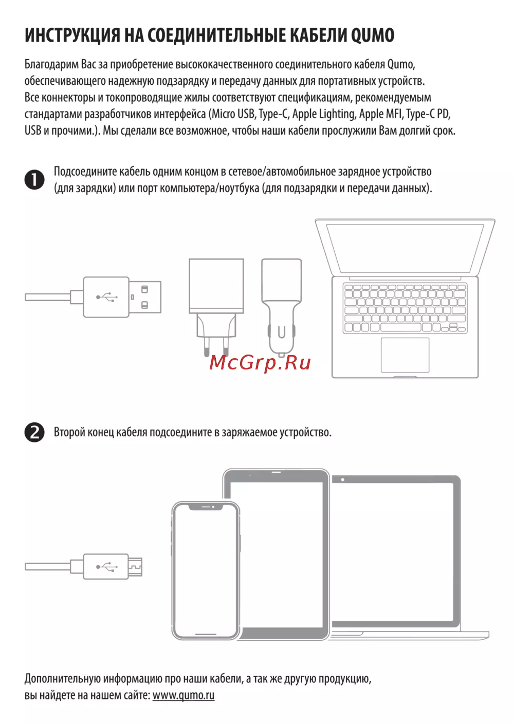 ИНСТРУКЦИЯ НА СОЕДИНИТЕЛЬНЫЕ КАБЕЛИ QUMO Благодарим Вас за приобретение высококачественного соединительного кабеля Qumo обеспечивающего надежную подзарядку и передачу данных для портативных устройств Все коннекторы и токопроводящие жилы соответствуют спецификациям рекомендуемым стандартами разработчиков интерфейса Micro USB Туре С Apple Lighting Apple MFI Type C PD USB и прочими Мы сделали все возможное чтобы наши кабели прослужили Вам долгий срок О Подсоедините кабель одним концом в сетевое автомобильное зарядное устройство для зарядки или порт компьютера ноутбука для подзарядки и передачи данных Второй конец кабеля подсоедините в заряжаемое устройство Дополнительную информацию про наши кабели а так же другую продукцию вы найдете на нашем сайте www qumo ru