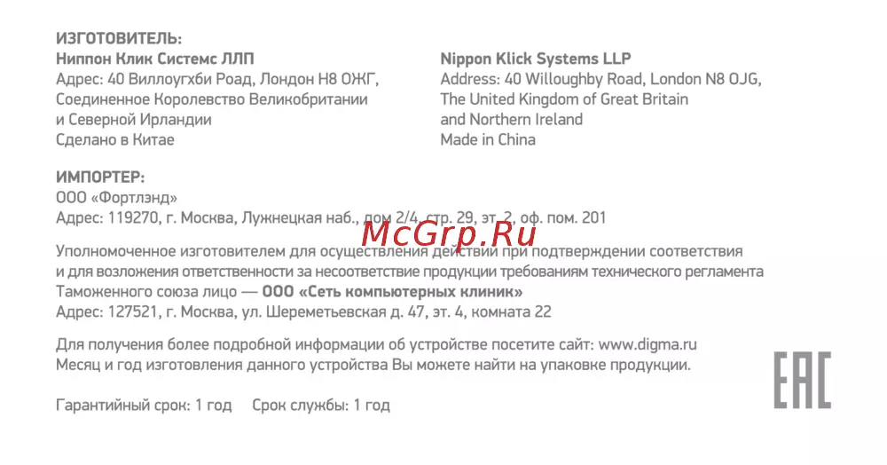 ИЗГОТОВИТЕЛЬ Ниппон Клик Системе ЛЛП Адрес 40 Виллоугхби Роад Лондон Н8 ОЖГ Соединенное Королевство Великобритании и Северной Ирландии Сделано в Китае Nippon Klick Systems LLP Address 40 Willoughby Road London N8 OJG The United Kingdom of Great Britain and Northern Ireland Made in China ИМПОРТЕР ООО Фортлэнд Адрес 119270 г Москва Лужнецкая наб дом 2 4 стр 29 эт 2 оф пом 201 Уполномоченное изготовителем для осуществления действий при подтверждении соответствия и для возложения ответственности за несоответствие продукции требованиям технического регламента Таможенного союза лицо ООО Сеть компьютерных клиник Адрес 127521 г Москва ул Шереметьевская д 47 зт 4 комната 22 Для получения более подробной информации об устройстве посетите сайт www digma ru Месяц и год изготовления данного устройства Вы можете найти на упаковке продукции Гарантийный срок 1 год Срок службы 1 год ЕНЕ