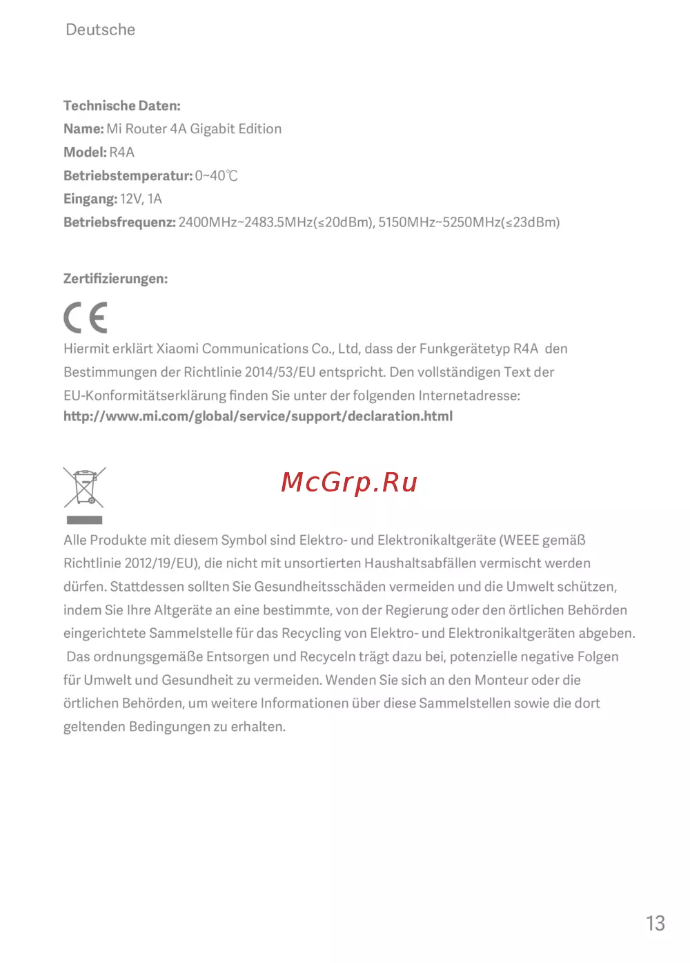 Hiermit erklärt Xiaomi Communications Co., Ltd, dass der Funkgerätetyp R4A den