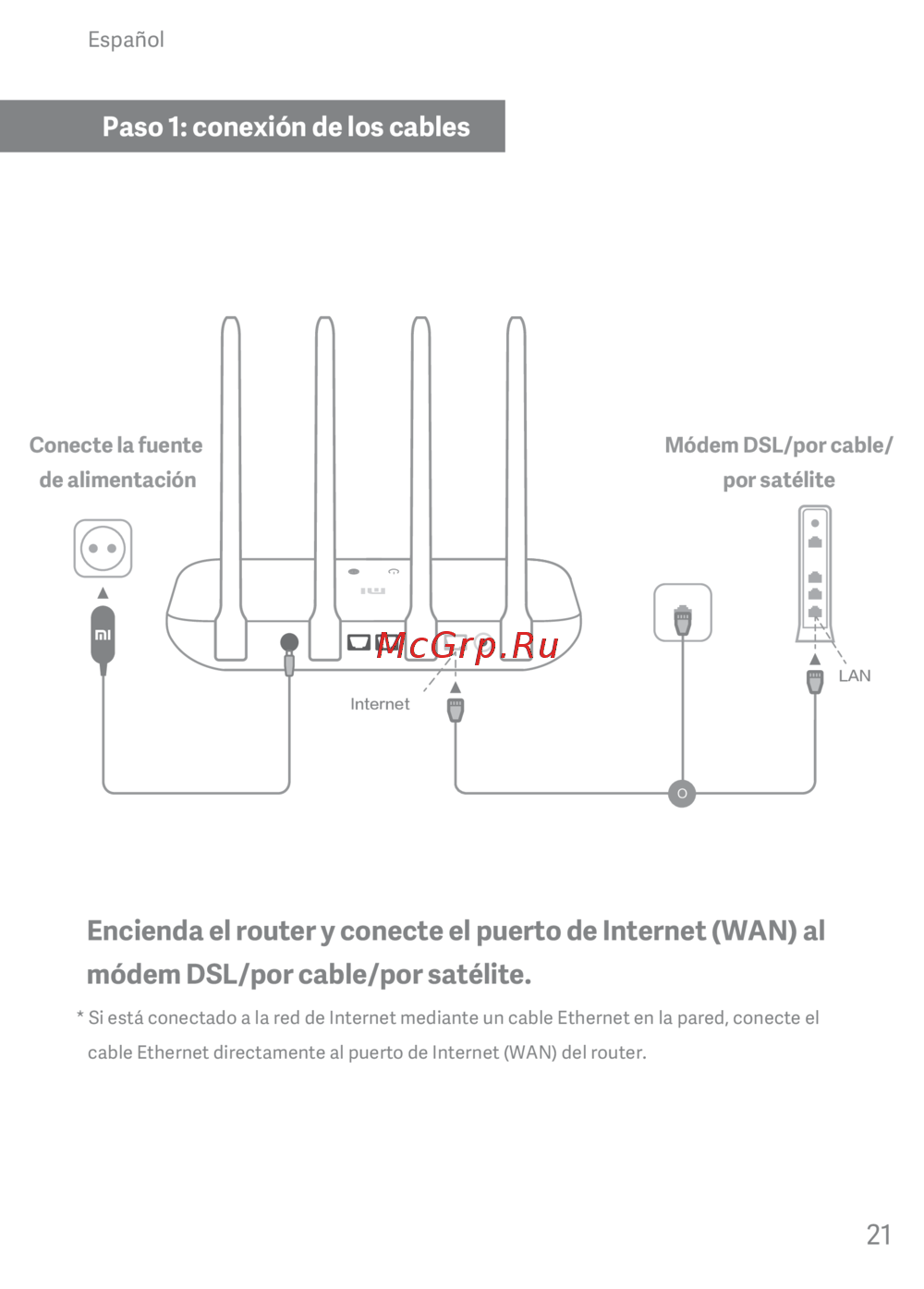 * Si está conectado a la red de Internet mediante un cable Ethernet en la pared, conecte el