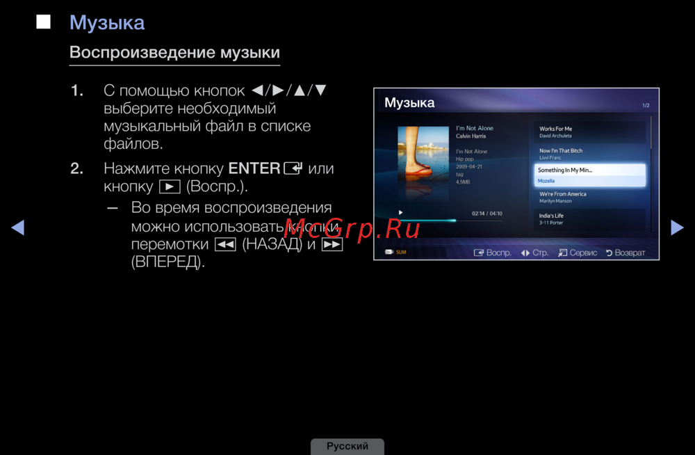 - С помощью кнопок перейдите к нужному файлу а затем нажмите кнопку enter e или воспр начнется воспроизведение файла в зависимости от способа перехода к экрану мое содержимое его вид может отличаться p.128