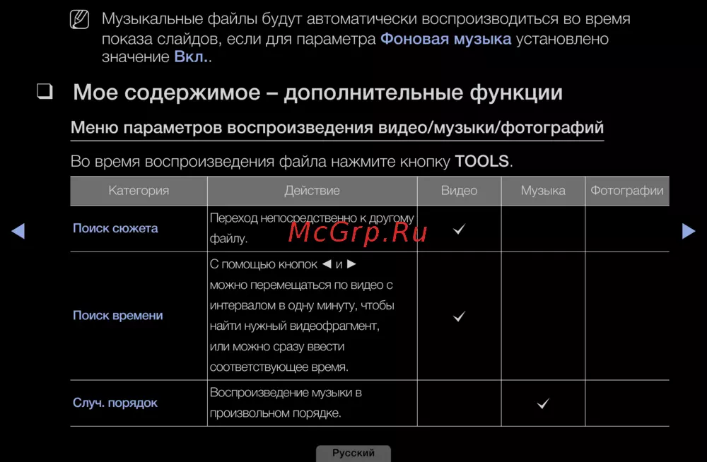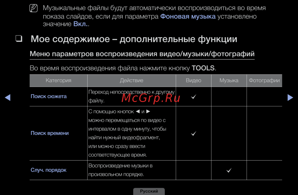 Меню❑параметров❑воспроизведения❑видео/музыки/фотографий
