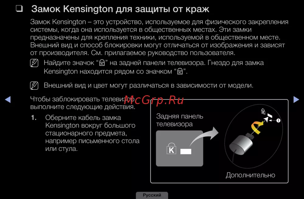 ” на задней панели телевизора. Гнездо для замка