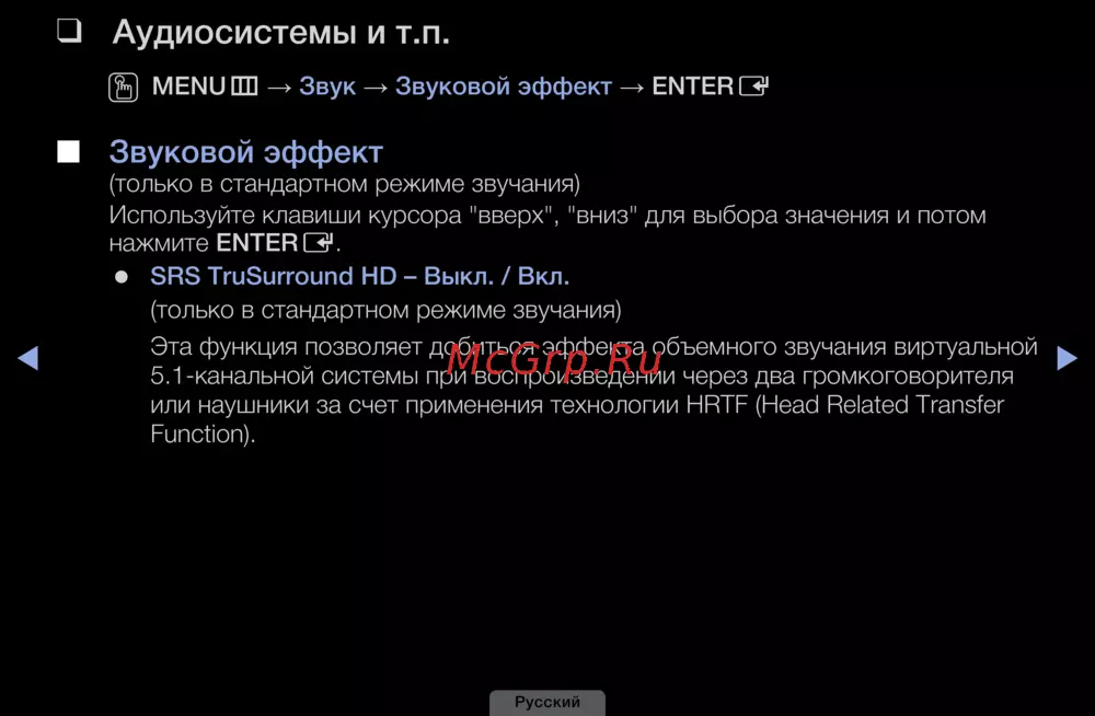 SRS❑TruSurround❑HD❑–❑Выкл.❑/❑Вкл.