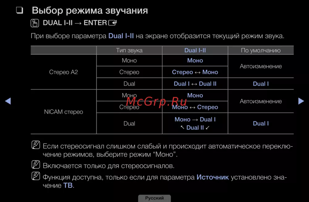 При выборе параметра Dual I-II на экране отобразится текущий режим звука.
