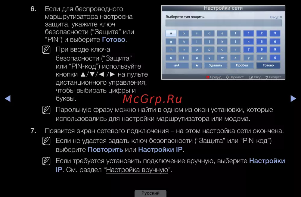 - Если для беспроводного маршрутизатора настроена защита укажите ключ безопасности защита или pin и выберите готово p.77