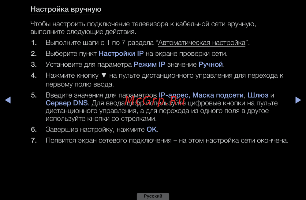 Чтобы настроить подключение телевизора к кабельной сети вручную,