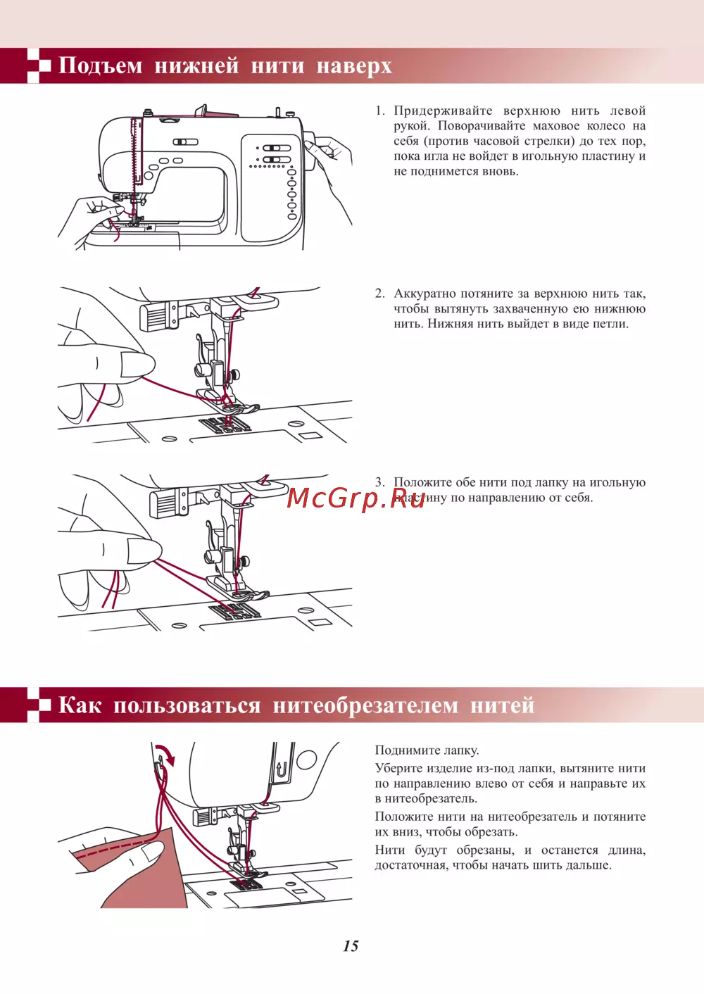 Подъем нижней нити наверх 1 Придерживайте верхнюю нить левой рукой Поворачивайте маховое колесо на себя против часовой стрелки до тех пор пока игла нс войдет в игольную пластину и нс поднимется вновь 2 Аккуратно потяните за верхнюю нить так чтобы вытянуть захваченную сю нижнюю нить Нижняя нить выйдет в виде петли 3 Положите обе нити под лапку на игольную пластину по направлению от себя Как пользоваться нитеобрезателем нитей Поднимите лапку Уберите изделие из под лапки вытяните нити по направлению влево от себя и направьте их в нитсобрсзатель Положите нити на нитсобрсзатель и потяните их вниз чтобы обрезать Нити будут обрезаны и останется достаточная чтобы начать шить дальше 15 длина