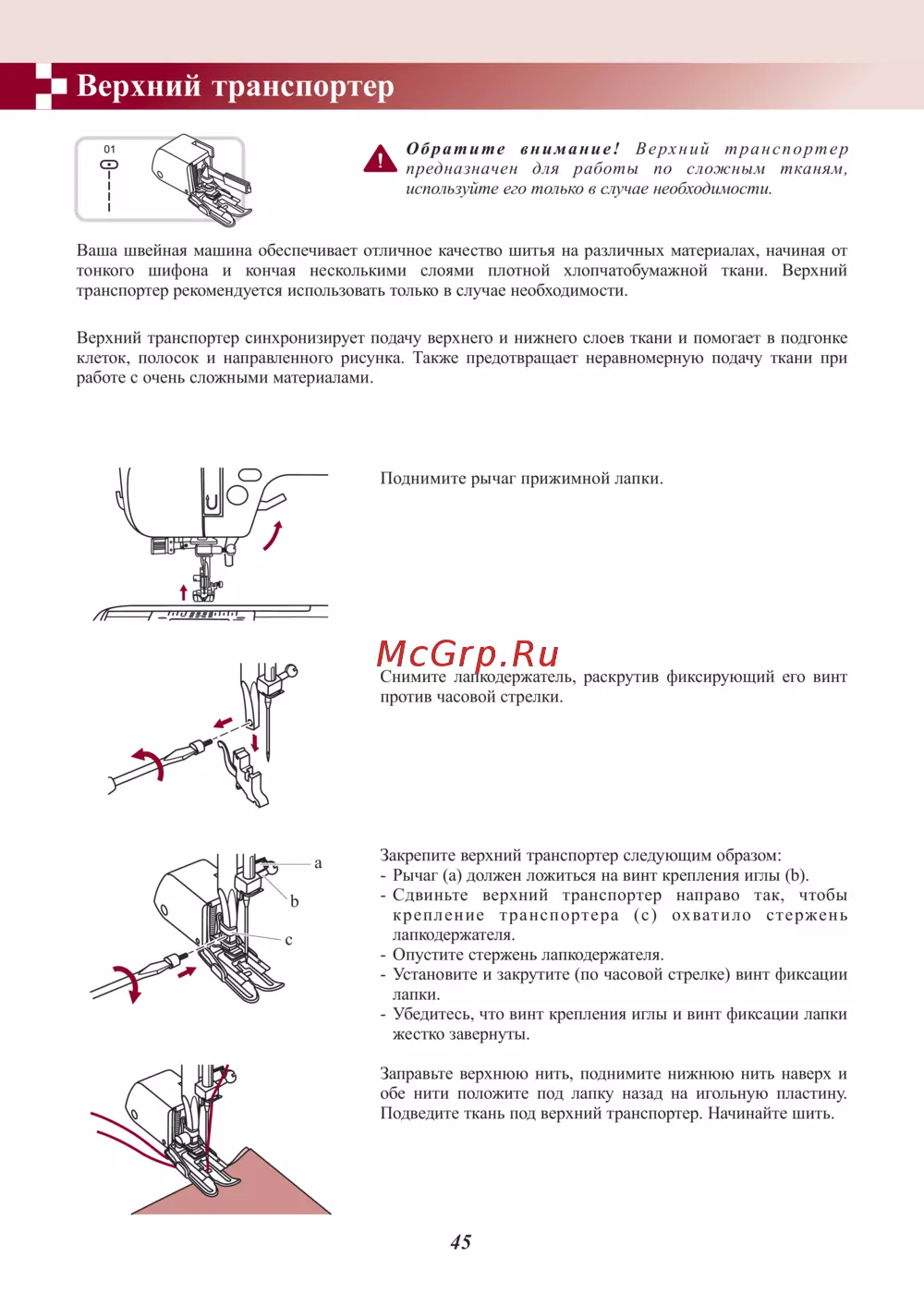 Верхний транспортер А Обратите внимание Верхний транспортер предназначен для работы по сложным тканям используйте его только в случае необходимости Ваша швейная машина обеспечивает отличное качество шитья на различных материалах начиная от тонкого шифона и кончая несколькими слоями плотной хлопчатобумажной ткани Верхний транспортер рекомендуется использовать только в случае необходимости Верхний транспортер синхронизирует подачу верхнего и нижнего слоев ткани и помогает в подгонке клеток полосок и направленного рисунка Также предотвращает неравномерную подачу ткани при работе с очень сложными материалами Поднимите рычаг прижимной лапки Снимите лапкодсржатсль против часовой стрелки раскрутив фиксирующий его винт Закрепите верхний транспортер следующим образом Рычаг а должен ложиться на винт крепления иглы Ь Сдвиньте верхний транспортер направо так чтобы крепление транспортера с охватило стержень лапкодсржатсля Опустите стержень лапкодсржатсля Установите и закрутите по часовой стрелке винт фиксации лапки Убедитесь что винт крепления иглы и винт фиксации лапки жестко завернуты Заправьте верхнюю нить поднимите нижнюю нить наверх и обе нити положите под лапку назад на игольную пластину Подведите ткань под верхний транспортер Начинайте шить 45