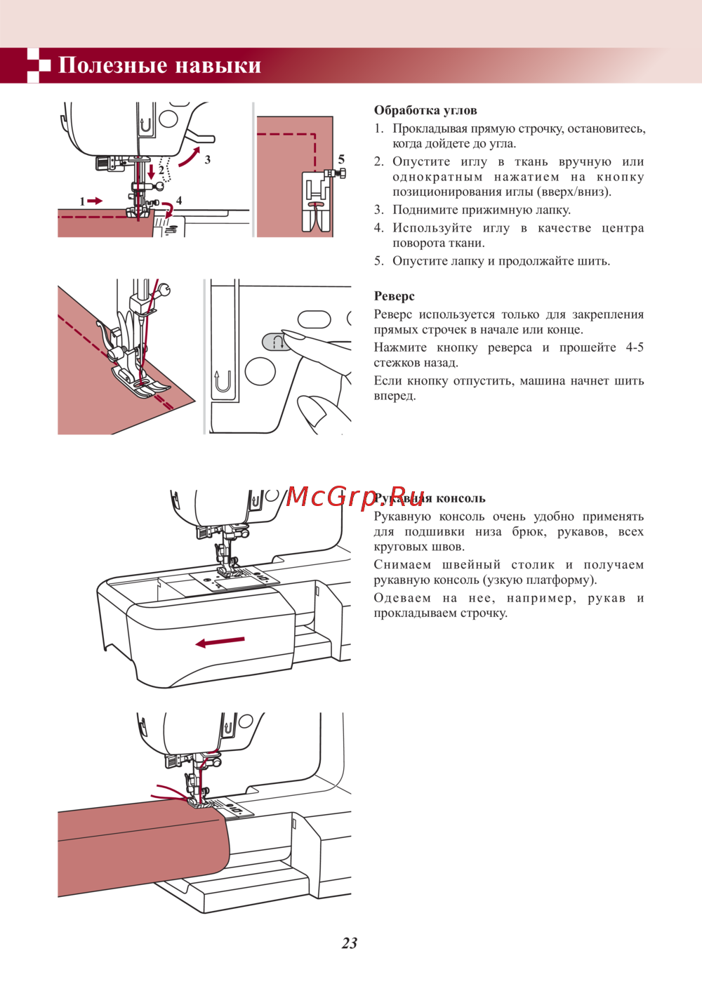 Полезные навыки Обработка углов 1 Прокладывая прямую строчку остановитесь когда дойдете до угла 2 Опустите иглу в ткань вручную или однократным нажатием на кнопку позиционирования иглы вверх вниз 3 Поднимите прижимную лапку 4 Используйте поворота ткани иглу в качестве центра 5 Опустите лапку и продолжайте шить Реверс Реверс используется только для прямых строчек в начале или конце Нажмите кнопку стежков назад Если кнопку вперед реверса отпустить закрепления и прошейте машина начнет 4 5 шить Рукавная консоль Рукавную консоль очень удобно применять для подшивки низа брюк рукавов всех круговых швов Снимаем швейный столик и рукавную консоль узкую платформу Одеваем на нее прокладываем строчку 23 например получаем рукав и