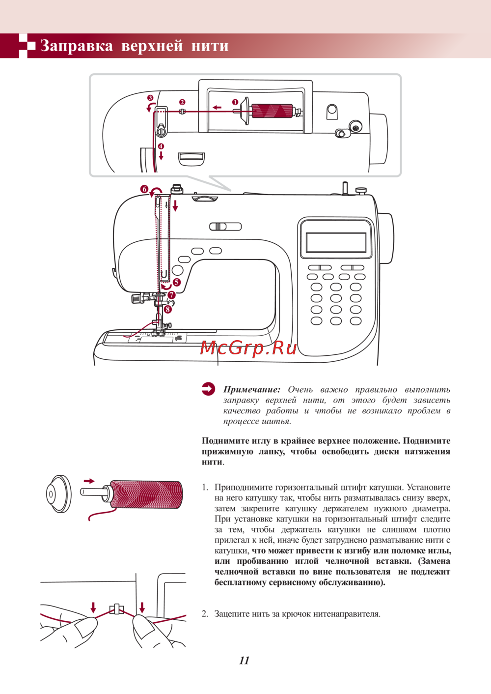 Заправка верхней нити Примечание Очень важно правильно выполнить заправку верхней нити от этого будет зависеть качество работы и чтобы не возникало проблем в процессе шитья Поднимите иглу в крайнее верхнее положение Поднимите прижимную лапку чтобы освободить диски натяжения нити Приподнимите горизонтальный штифт катушки Установите на него катушку так чтобы нить разматывалась снизу вверх затем закрепите катушку держателем нужного диаметра При установке катушки на горизонтальный штифт следите за тем чтобы держатель катушки нс слишком плотно прилегал к ней иначе будет затруднено разматывание нити с катушки что может привести к изгибу или потомке иглы или пробиванию иглой челночной вставки Замена челночной вставки по вине пользователя не подлежит бесплатному сервисному обслуживанию Зацепите нить за крючок нитснаправитсля 11