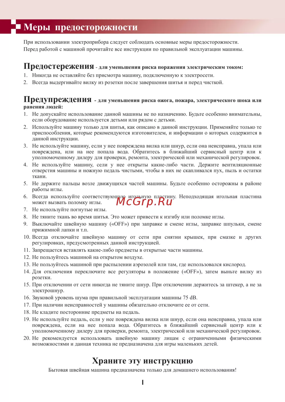Меры предосторожности При использовании электроприбора следует соблюдать основные меры предосторожности Перед работой с машиной прочитайте все инструкции по правильной эксплуатации машины Предостережения для уменьшения риска поражения электрическим током 1 Никогда нс оставляйте без присмотра машину подключенную к электросети 2 Всегда выдергивайте вилку из розетки после завершения шитья и перед чисткой Предупреждения для уменьшения риска ожога пожара электрического шока или ранения людей 1 Нс допускайте использование данной машины нс по назначению Будьте особенно внимательны если оборудование используется детьми или рядом с детьми 2 Используйте машину только для шитья как описано в данной инструкции Применяйте только тс приспособления которые рекомендуются изготовителем и информации о которых содержится в данной инструкции 3 Нс используйте машину если у нес повреждена вилка или шнур если она неисправна упала или повреждена или на нес попала вода Обратитесь в ближайший сервисный центр или к уполномоченному дилеру для проверки ремонта электрической или механической регулировок 4 Нс используйте машину если у нес открыты какие либо части Держите вентиляционные отверстия машины и ножную педаль чистыми чтобы в них нс скапливался пух пыль и остатки ткани 5 Нс держите пальцы возле движущихся частей машины Будьте особенно осторожны в районе работы иглы 6 Всегда используйте соответствующую игольную пластину Неподходящая игольная пластина может вызвать поломку иглы 7 Нс используйте погнутые иглы 8 Нс тяните ткань во время шитья Это может привести к изгибу или поломке иглы 9 Выключайте швейную машину ОББ при заправке и смене иглы заправке шпульки смене прижимной лапки и т п 10 Всегда отключайте швейную машину от сети при снятии крышек при смазке и других регулировках предусмотренных данной инструкцией 11 Запрещается вставлять какие либо предметы в открытые части машины 12 Нс пользуйтесь машиной на открытом воздухе 13 Нс пользуйтесь машиной при распылении аэрозолей или там где использовался кислород 14 Для отключения переключите все регуляторы в положение ОББ затем выньте вилку из розетки 15 При отключении от сети никогда нс тяните шнур При отключении держитесь за штекер а нс за электрошнур 16 Звуковой уровень шума при правильной эксплуатации машины 75 с В 17 При наличии неисправностей у машины обязательно отключите се от сети 18 Нс кладите посторонние предметы на педаль 19 Нс используйте педаль если у нес повреждена вилка или шнур если она неисправна упала или повреждена если на нес попала вода Обратитесь в ближайший сервисный центр или к уполномоченному дилеру для проверки ремонта электрической или механической регулировок 20 Нс рекомендуется использовать швейную машину лицам с ограниченными физическими возможностями и данная техника нс предназначена для игры маленьких детей Храните эту инструкцию Бытовая швейная машина предназначена только для домашнего использования