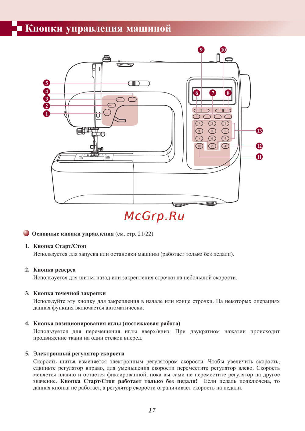 Кнопки управления машиной Основные кнопки управления см стр 21 22 1 Кнопка Старт Стоп Используется для запуска или остановки машины работает только без педали 2 Кнопка реверса Используется для шитья назад или закрепления строчки на небольшой скорости 3 Кнопка точечной закрепки Используйте эту кнопку для закрепления в начале или конце строчки На некоторых операциях данная функция включается автоматически 4 Кнопка позиционирования иглы постежковая работа Используется для перемещения иглы вверх вниз При продвижение ткани на один стежок вперед двукратном нажатии происходит 5 Электронный регулятор скорости Скорость шитья изменяется электронным регулятором скорости Чтобы увеличить скорость сдвиньте регулятор вправо для уменьшения скорости переместите регулятор влево Скорость меняется плавно и остается фиксированной пока вы сами нс переместите регулятор на другое значение Кнопка Старт Стоп работает только без педали Если педаль подключена то данная кнопка нс работает а регулятор скорости ограничивает скорость на педали 17