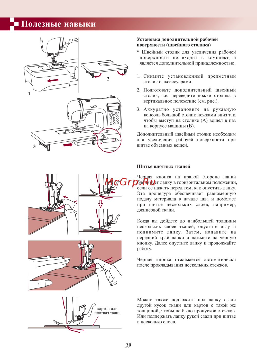 Полезные навыки Установка дополнительной рабочей поверхности швейного столика Швейный столик для увеличения рабочей поверхности нс входит в комплект а является дополнительной принадлежностью 1 Снимите установленный столик с аксессуарами предметный 2 Подготовьте дополнительный швейный столик т е переведите ножки столика в вертикальное положение см рис 3 Аккуратно установите на рукавную консоль большой столик ножками вниз так чтобы выступ на столике А вошел в паз на корпусе машины В Дополнительный швейный столик необходим для увеличения рабочей поверхности при шитье объемных вещей Шитье плотных тканей Черная кнопка на правой стороне лапки блокирует лапку в горизонтальном положении если ее нажать перед тем как опустить лапку Эта процедура обеспечивает равномерную подачу материала в начале шва и помогает при шитье нескольких слоев например джинсовой ткани Когда вы дойдете до наибольшей толщины нескольких слоев тканей опустите иглу и поднимите лапку Затем надавите на передний край лапки и нажмите на черную кнопку Далее опустите лапку и продолжайте работу Черная кнопка отжимается автоматически после прокладывания нескольких стежков Можно также подложить под лапку сзади другой кусок ткани или картон с такой же толщиной чтобы нс было пропусков стежков Или поддержать лапку рукой сзади при шитье в несколько слоев 29