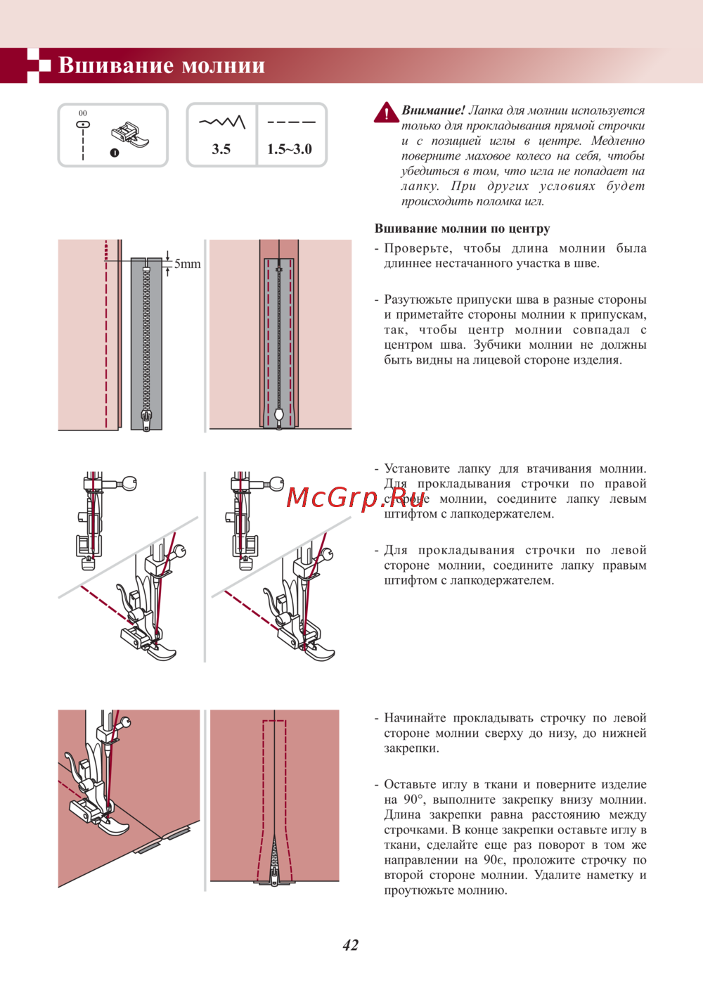 Вшивание молнии Внимание Лапка для молнии используется только для прокладывания прямой строчки и с позицией иглы в центре Медленно поверните маховое колесо на себя чтобы убедиться в том что игла не попадает на лапку При других условиях будет происходить поломка игл Вшивание молнии по центру Проверьте чтобы длина молнии длиннее нсстачанного участка в шве была Разутюжьте припуски шва в разные стороны и приметайте стороны молнии к припускам так чтобы центр молнии совпадал с центром шва Зубчики молнии нс должны быть видны на лицевой стороне изделия Установите лапку для втачивания молнии Для прокладывания строчки по правой стороне молнии соедините лапку левым штифтом с лапкодсржатслсм Для прокладывания строчки по левой стороне молнии соедините лапку правым штифтом с лапкодсржатслсм Начинайте прокладывать строчку по левой стороне молнии сверху до низу до нижней закрепки Оставьте иглу в ткани и поверните изделие на 90 выполните закрепку внизу молнии Длина закрепки равна расстоянию между строчками В конце закрепки оставьте иглу в ткани сделайте еще раз поворот в том же направлении на 90с проложите строчку по второй стороне молнии Удалите наметку и проутюжьте молнию 42
