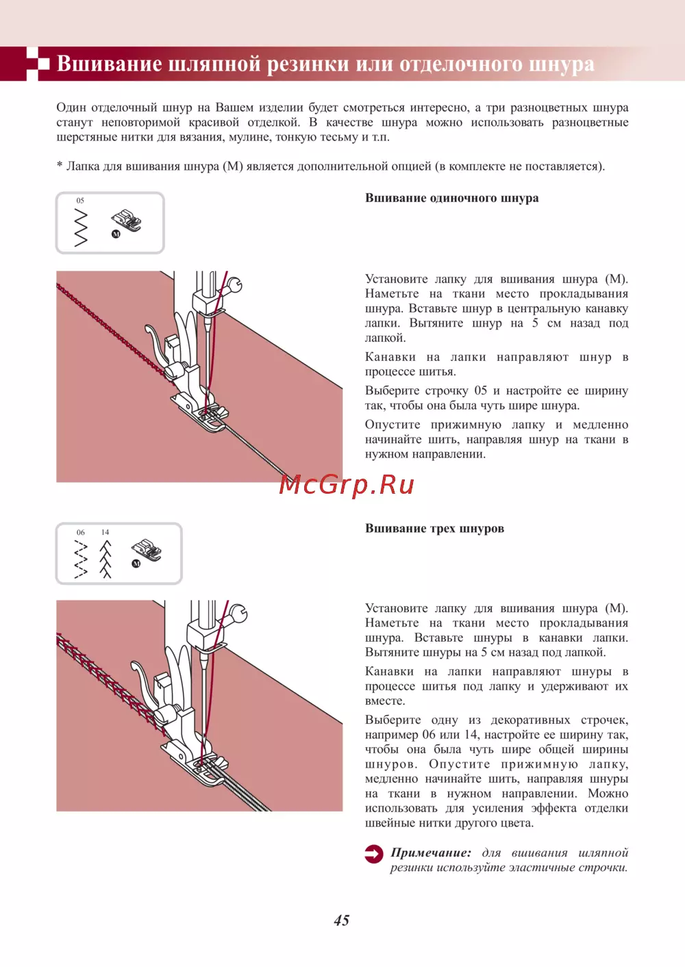 Вшивание шляпной резинки или отделочного лиг Один отделочный шнур на Вашем изделии будет смотреться интересно а три разноцветных шнура станут неповторимой красивой отделкой В качестве шнура можно использовать разноцветные шерстяные нитки для вязания мулине тонкую тесьму и т п Лапка для вшивания шнура М является дополнительной опцией в комплекте нс поставляется Вшивание одиночного шнура Установите лапку для вшивания шнура М Наметьте на ткани место прокладывания шнура Вставьте шнур в центральную канавку лапки Вытяните шнур на 5 см назад под лапкой Канавки на лапки процессе шитья направляют шнур в Выберите строчку 05 и настройте ее ширину так чтобы она была чуть шире шнура Опустите прижимную лапку и медленно начинайте шить направляя шнур на ткани в нужном направлении Вшивание трех шнуров Установите лапку для вшивания шнура М Наметьте на ткани место прокладывания шнура Вставьте шнуры в канавки лапки Вытяните шнуры на 5 см назад под лапкой Канавки на лапки направляют шнуры в процессе шитья под лапку и удерживают их вместе Выберите одну из декоративных строчек например 06 или 14 настройте ее ширину так чтобы она была чуть шире общей ширины шнуров Опустите прижимную лапку медленно начинайте шить направляя шнуры на ткани в нужном направлении Можно использовать для усиления эффекта отделки швейные нитки другого цвета Примечание для вшивания шляпной резинки используйте эластичные строчки 45