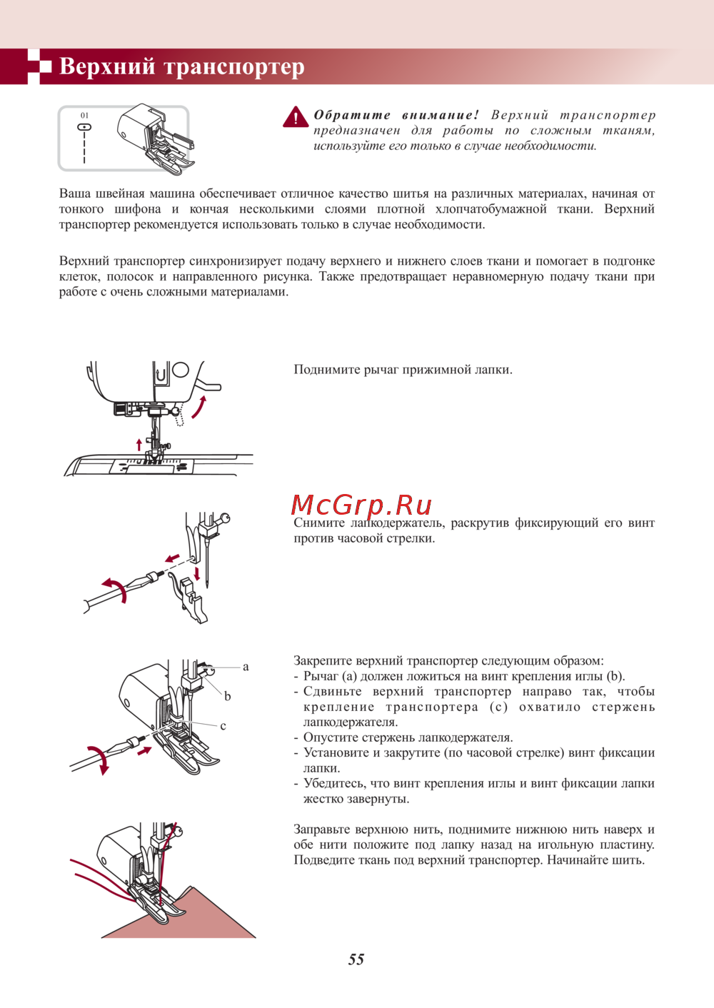 Верхний транспортер Обратите внимание Верхний транспортер предназначен для работы по сложным тканям используйте его только в случае необходимости Ваша швейная машина обеспечивает отличное качество шитья на различных материалах начиная от тонкого шифона и кончая несколькими слоями плотной хлопчатобумажной ткани Верхний транспортер рекомендуется использовать только в случае необходимости Верхний транспортер синхронизирует подачу верхнего и нижнего слоев ткани и помогает в подгонке клеток полосок и направленного рисунка Также предотвращает неравномерную подачу ткани при работе с очень сложными материалами Поднимите рычаг прижимной лапки Снимите лапкодсржатсль раскрутив фиксирующий его винт против часовой стрелки Закрепите верхний транспортер следующим образом Рычаг а должен ложиться на винт крепления иглы Ь Сдвиньте верхний транспортер направо так чтобы крепление транспортера с охватило стержень лапкодсржатсля Опустите стержень лапкодсржатсля Установите и закрутите по часовой стрелке винт фиксации лапки Убедитесь что винт крепления иглы и винт фиксации лапки жестко завернуты Заправьте верхнюю нить поднимите нижнюю нить наверх и обе нити положите под лапку назад на игольную пластину Подведите ткань под верхний транспортер Начинайте шить