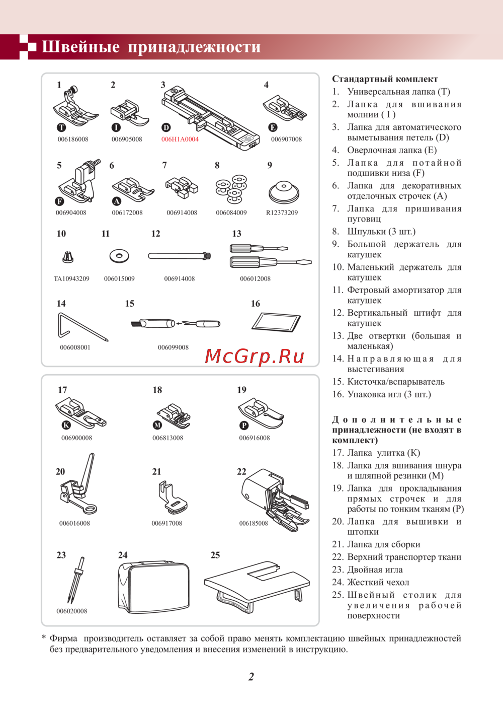 Швейные принадлежности Стандартный комплект 1 Универсальная лапка Т 2 Лапка для вшивания молнии I 3 Лапка для автоматического выметывания петель В 4 Оверлочная лапка Е 5 Лапка для потайной подшивки низа Е 6 Лапка для декоративных отделочных строчек А 7 Лапка для пришивания пуговиц 8 Шпульки 3 шт 9 Большой держатель для катушек 10 Маленький держатель для катушек 11 Фетровый амортизатор для катушек 12 Вертикальный штифт для катушек 13 Две отвертки большая и маленькая 14 Направляющая для выстегивания 15 Кисточка вспарыватсль 16 Упаковка игл 3 шт Дополнительные принадлежности не входят в комплект 17 Лапка улитка К 18 Лапка для вшивания шнура и шляпной резинки М 19 Лапка для прокладывания прямых строчек и для работы по тонким тканям Р 20 Лапка для вышивки и штопки 21 Лапка для сборки 22 Верхний транспортер ткани 23 Двойная игла 24 Жесткий чехол 25 Швейный столик для увеличения рабочей поверхности Фирма производитель оставляет за собой право менять комплектацию швейных принадлежностей без предварительного уведомления и внесения изменений в инструкцию 2