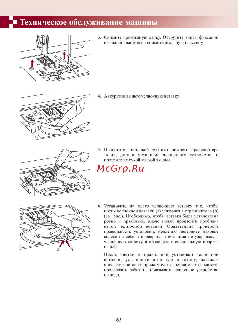 Техническое обслуживание машины 3 Снимите прижимную лапку Открутите винты фиксации игольной пластины и снимите игольную пластину 4 Аккуратно выньте челночную вставку 5 Почистите кисточкой зубчики нижнего транспортера ткани детали механизма челночного устройства и протрите их сухой мягкой тканью 6 Установите на место челночную вставку так чтобы носик челночной вставки а упирался в ограничитель Ь см рис Необходимо чтобы вставка была установлена ровно и правильно иначе может произойти пробивка иглой челночной вставки Обязательно проверьте правильность установки медленно поверните маховое колесо на себя и проверьте чтобы игла нс ударялась в челночную вставку а проходила в специальную прорезь на ней После чистки и правильной установки челночной вставки установите игольную пластину вставьте шпульку поставьте прижимную лапку на место и можете продолжать работать Смазывать челночное устройство нс надо 61