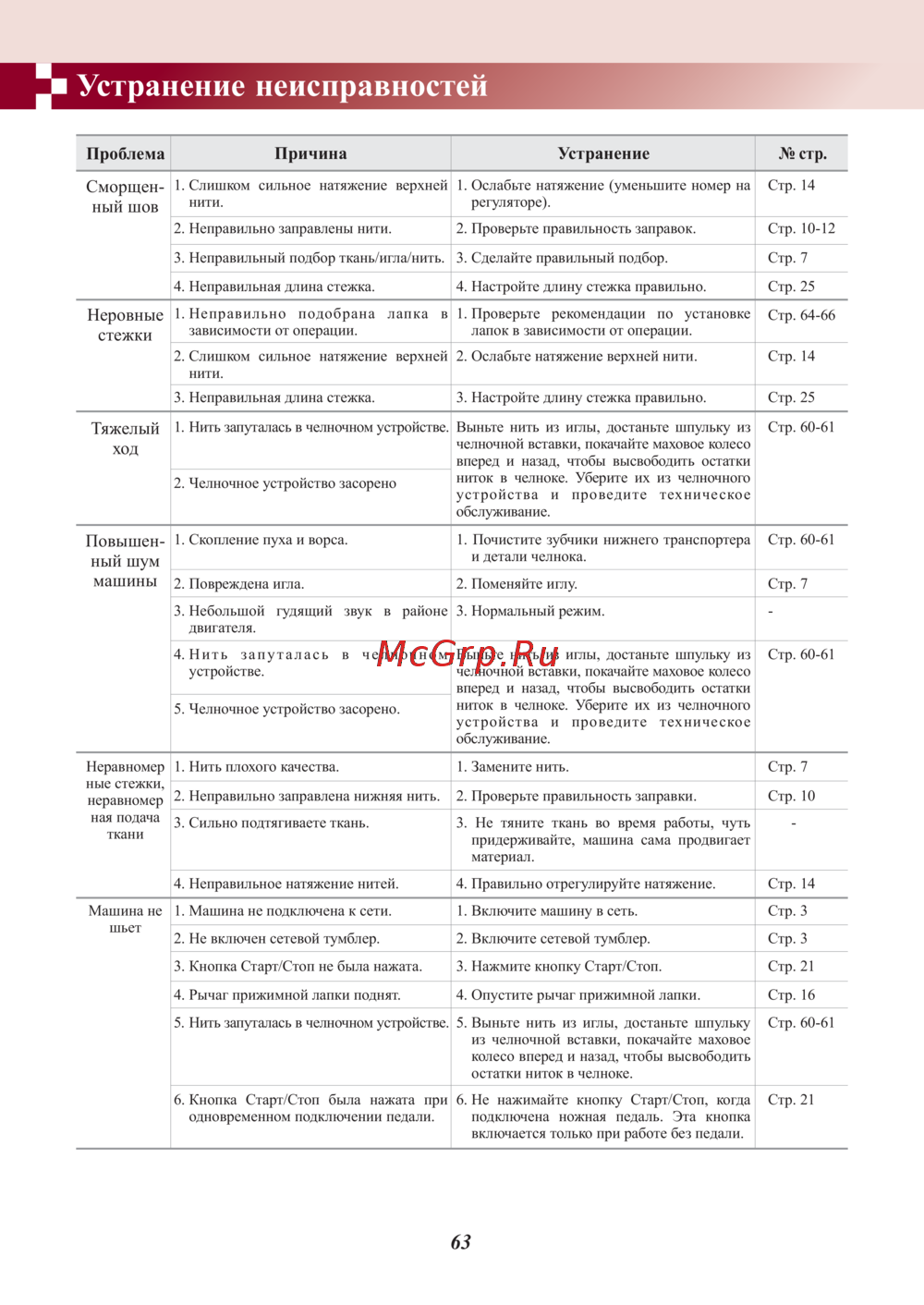 Устранение неисправностей Проблема Причина Сморщен Слишком сильное натяжение верхней нити ный шов Устранение 1 Ослабьте натяжение уменьшите номер на регуляторе Стр 14 2 Неправильно заправлены нити 2 Проверьте правильность заправок Стр 10 12 3 Неправильный подбор ткань игла нить 3 Сделайте правильный подбор Стр 7 4 11еправильная длина стежка 4 11астройте длину стежка правильно Стр 25 1 Проверьте рекомендации по установке лапок в зависимости от операции Стр 64 66 2 Слишком сильное натяжение верхней нити 2 Ослабьте натяжение верхней нити Стр 14 3 11еправильная длина стежка 3 11астройте длину стежка правильно Стр 25 Неровные 1 Неправильно подобрана лапка в зависимости от операции стежки Тяжелый 1 11ить запуталась в челночном устройстве Выньте нить из иглы достаньте шпульку из челночной вставки покачайте маховое колесо ход 2 Челночное устройство засорено Повышен 1 Скопление пуха и ворса ный шум машины 2 Повреждена игла Стр 60 61 вперед и назад чтобы высвободить остатки ниток в челноке Уберите их из челночного устройства и проведите техническое обслуживание 1 Почистите зубчики нижнего транспортера и детали челнока Стр 60 61 2 Поменяйте иглу Стр 7 3 Небольшой гудящий звук в районе двигателя 3 Нормальный режим 4 Нить запуталась в челночном устройстве Выньте нить из иглы достаньте шпульку из челночной вставки покачайте маховое колесо вперед и назад чтобы высвободить остатки ниток в челноке Уберите их из челночного устройства и проведите техническое обслуживание Стр 60 61 1 Замените нить Стр 7 2 Проверьте правильность заправки Стр 10 5 Челночное устройство засорено 11ерав номер 1 11ить плохого качества ные стежки неравномер 2 Неправильно заправлена нижняя нить ная подача 3 Сильно подтягиваете ткань ткани Машина не шьет стр 3 Не тяните ткань во время работы чуть придерживайте машина сама продвигает материал 4 Неправильное натяжение нитей 4 Правильно отрегулируйте натяжение Стр 14 1 Машина не подключена к сети 1 Включите машину в сеть Стр 3 2 Не включен сетевой тумблер 2 Включите сетевой тумблер Стр 3 3 Кнопка Старт Стоп не была нажата 3 Нажмите кнопку Старт Стоп Стр 21 4 Рычаг прижимной лапки поднят 4 Опустите рычаг прижимной лапки Стр 16 5 11ить запуталась в челночном устройстве 5 Выньте нить из иглы достаньте шпульку из челночной вставки покачайте маховое колесо вперед и назад чтобы высвободить остатки ниток в челноке Стр 60 61 6 Кнопка Старт Стоп была нажата при одновременном подключении педали Стр 21 6 Не нажимайте кнопку Старт Стоп когда подключена ножная педаль Эта кнопка включается только при работе без педали 63