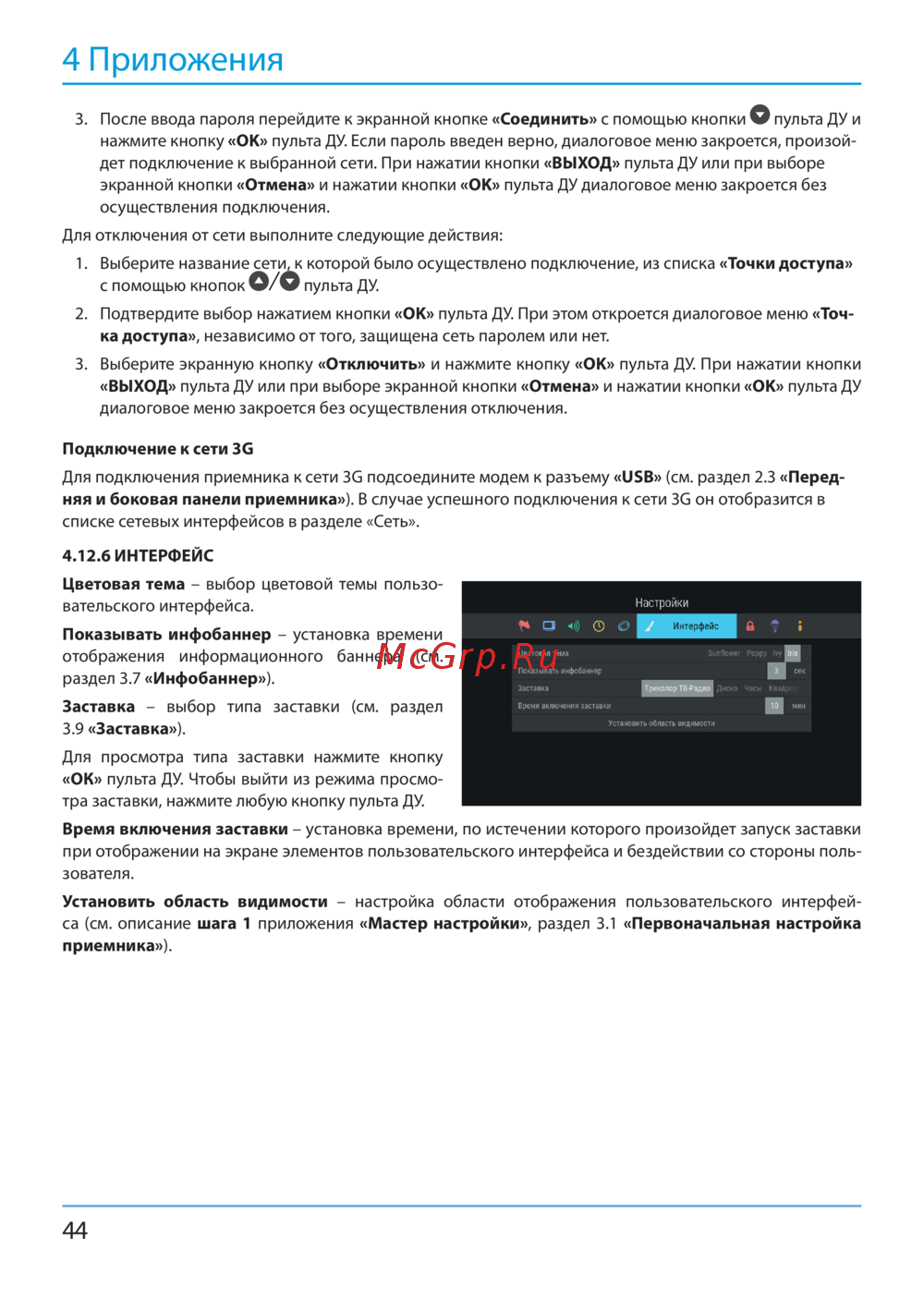 няя и боковая панели приемника»). В случае успешного подключения к сети 3G он отобразится в