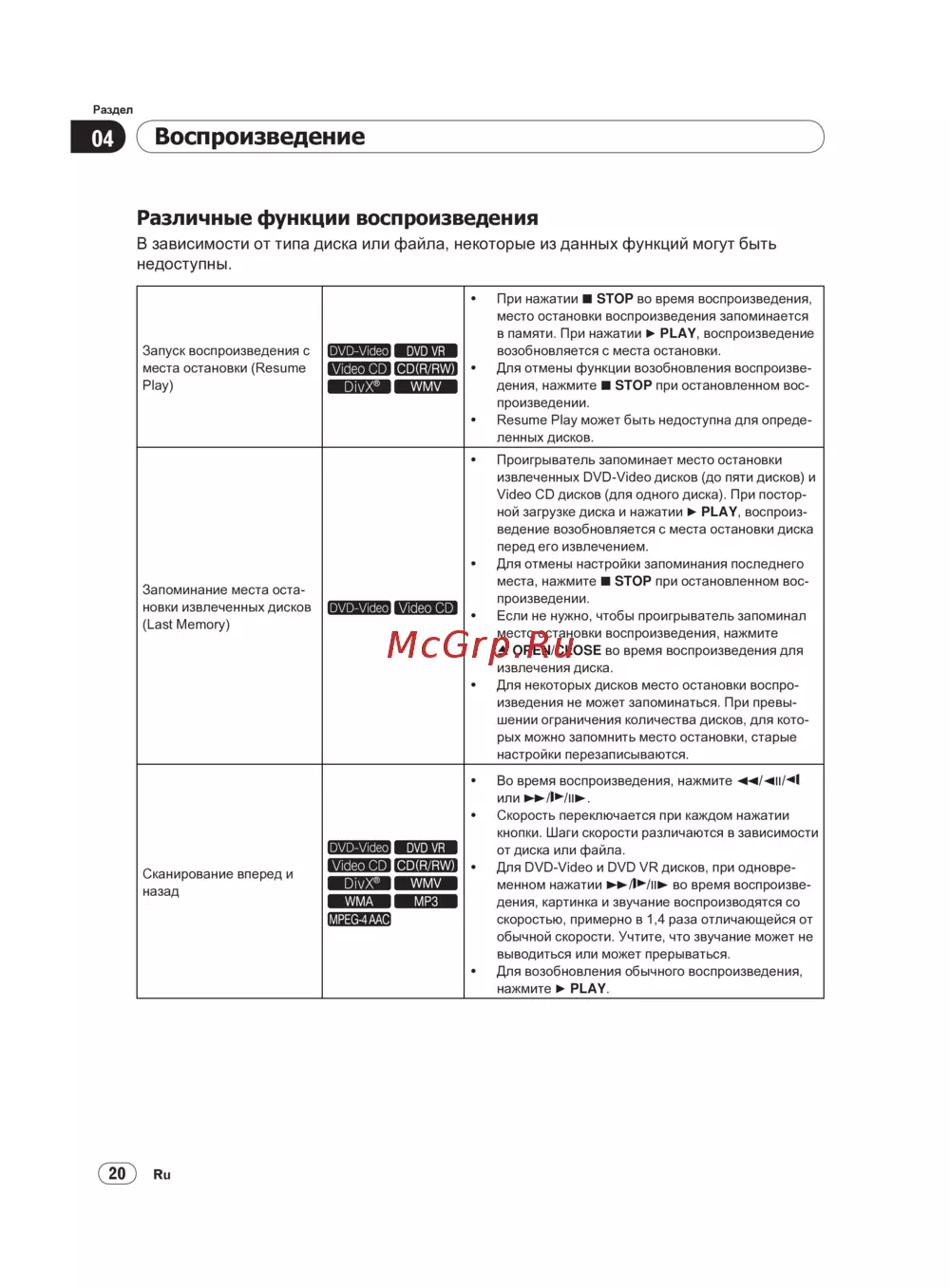 Узнайте о различных функциях воспроизведения, таких как возобновление с места остановки и запоминание последних дисков. Управляйте воспроизведением эффективно.
