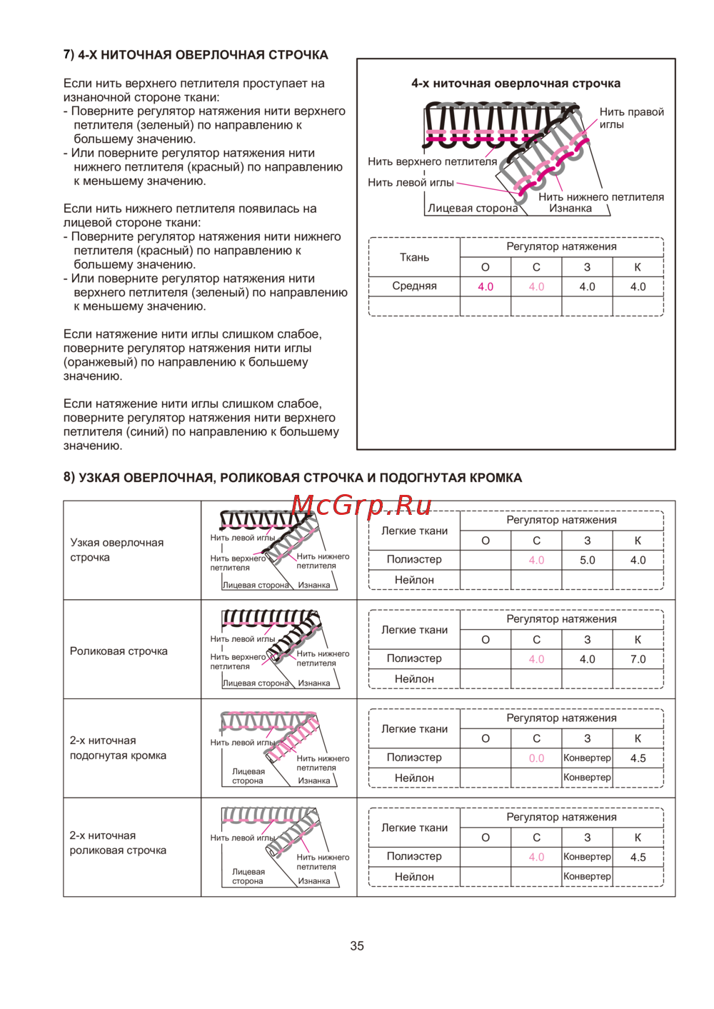 - Если нить верхнего петлителя проступает на изнаночной стороне ткани поверните регулятор натяжения нити верхнего петлителя зеленый по направлению к большему значению или поверните регулятор натяжения нити нижнего петлителя красный по направлению к меньшему значению если нить нижнего петлителя появилась на лицевой стороне ткани поверните регулятор натяжения нити верхнего петлителя зеленый по направлению к большему значению или поверните регулятор натяжения нити нижнего петлителя красный по направлению к меньшему значению если натяжение нити иглы слишком слабое поверните регулятор натяжения нити иглы оранжевый или синий по направлению к большему значению p.35