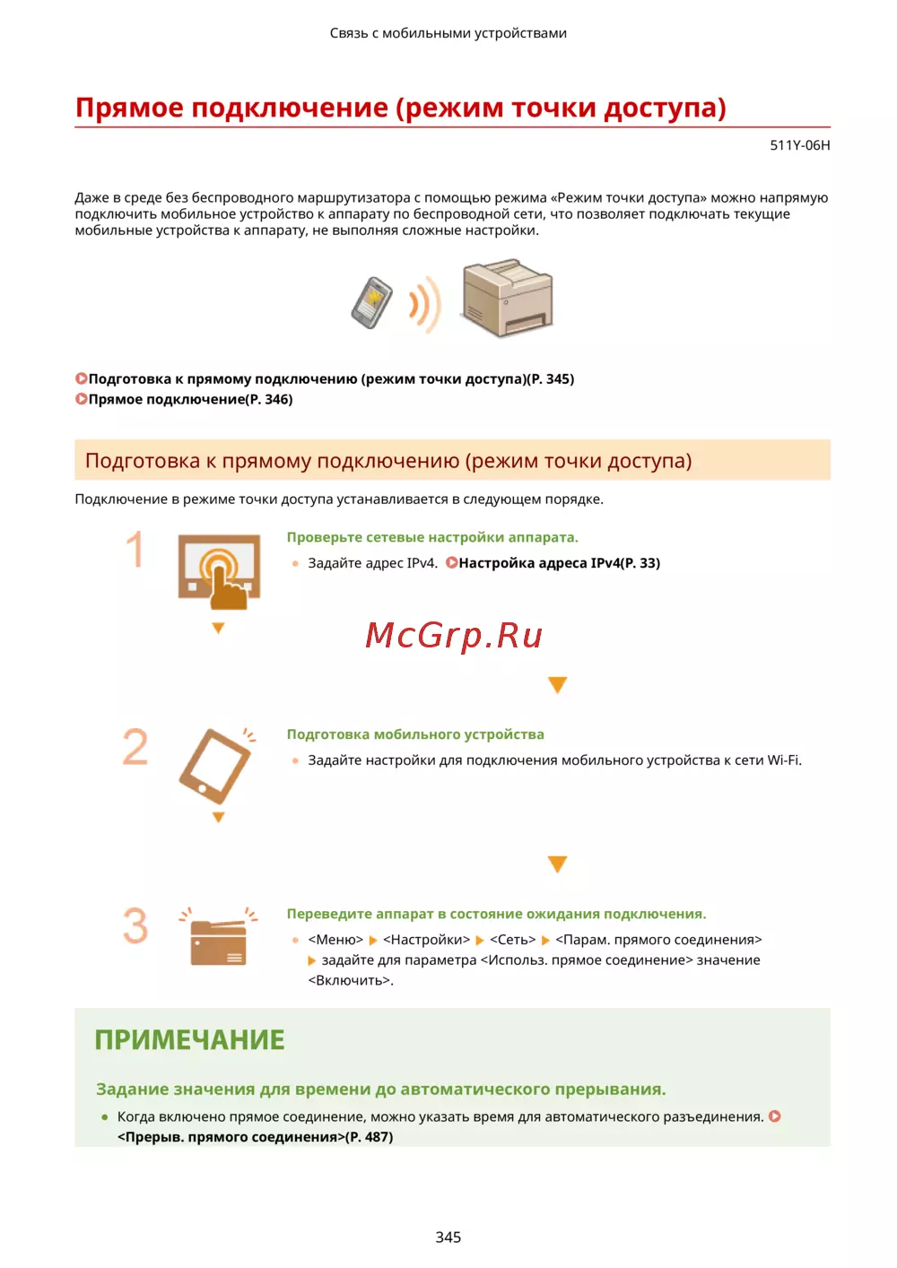 Подготовка к прямому подключению (режим точки доступа)(P. 345)