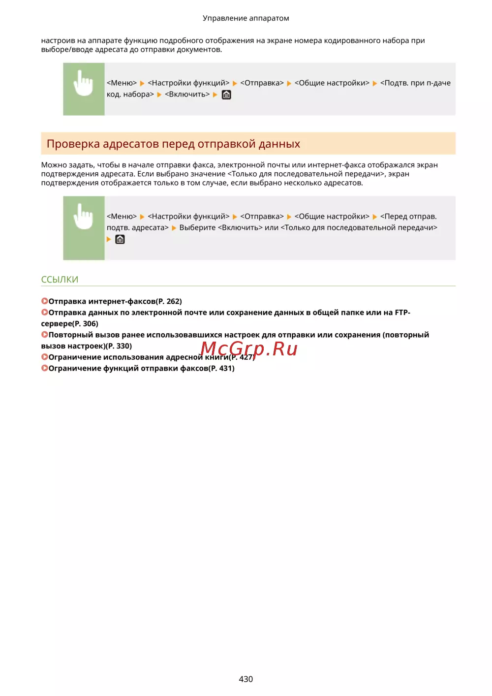 <Меню> <Настройки функций> <Отправка> <Общие настройки> <Подтв. при п-даче