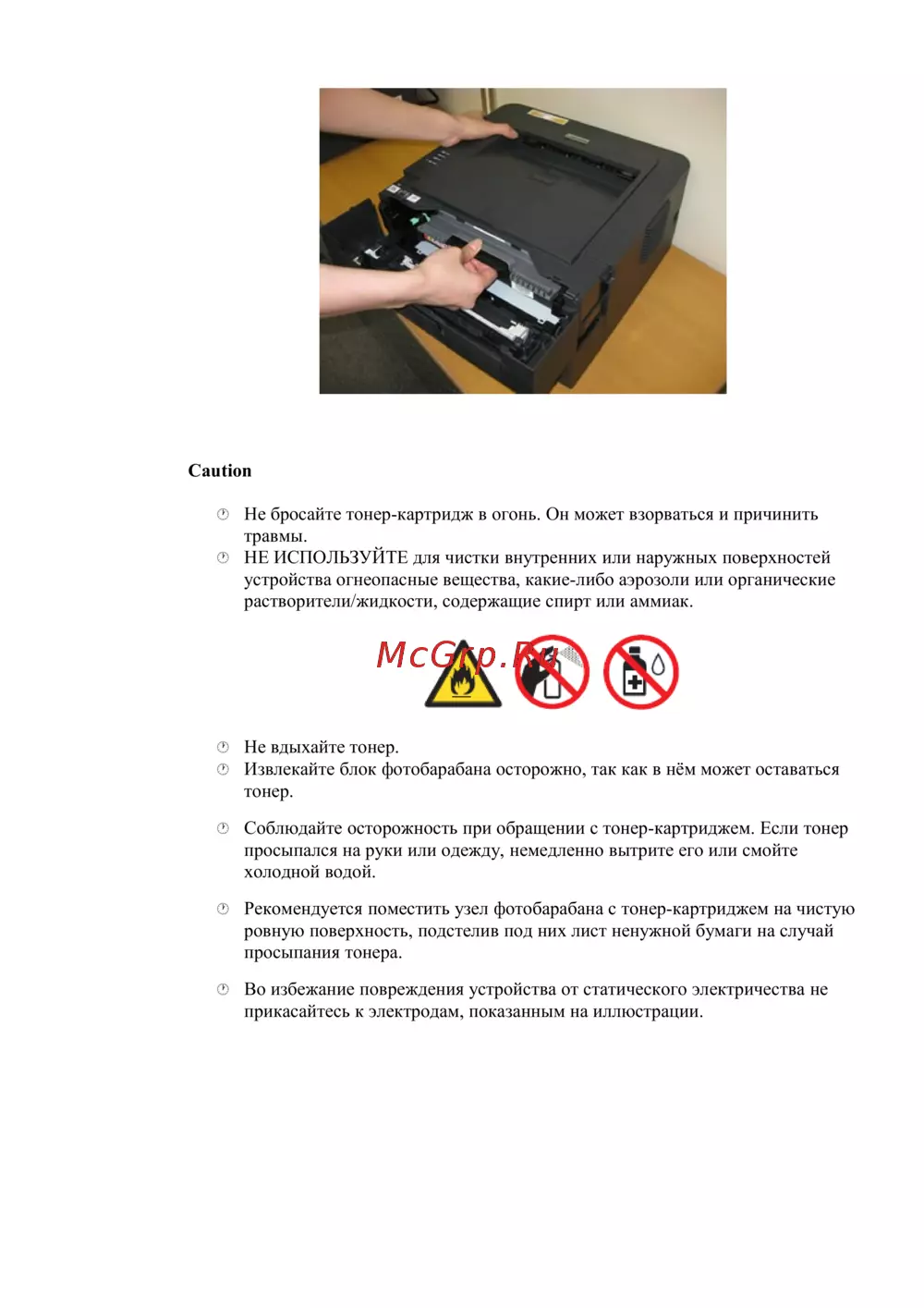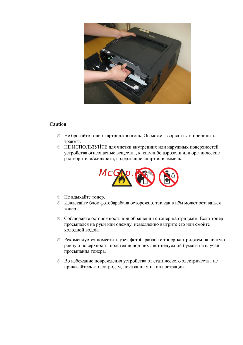Не бросайте тонер-картридж в огонь. Он может взорваться и причинить