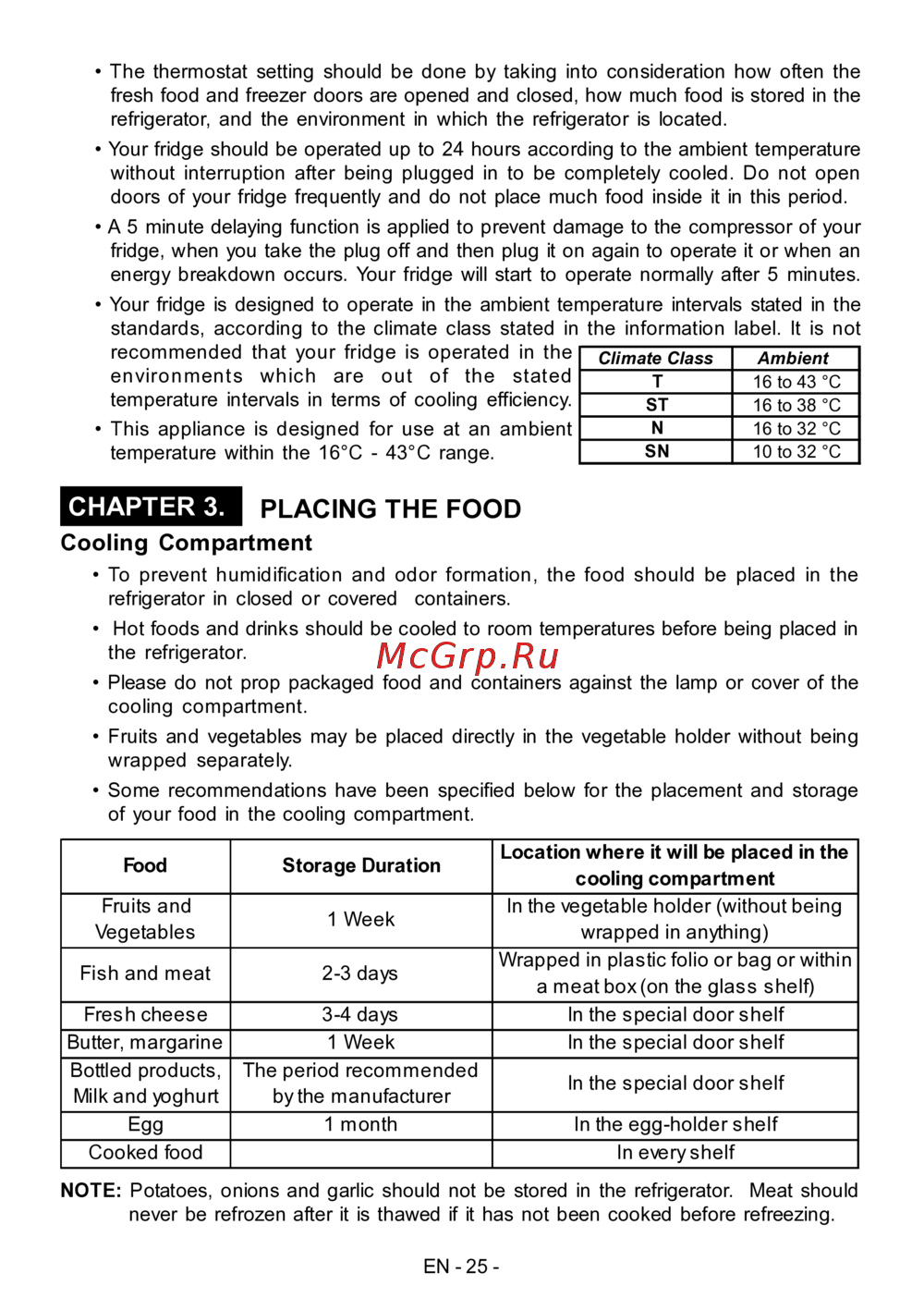 NOTE: Potatoes, onions and garlic should not be stored in the refrigerator. Meat should