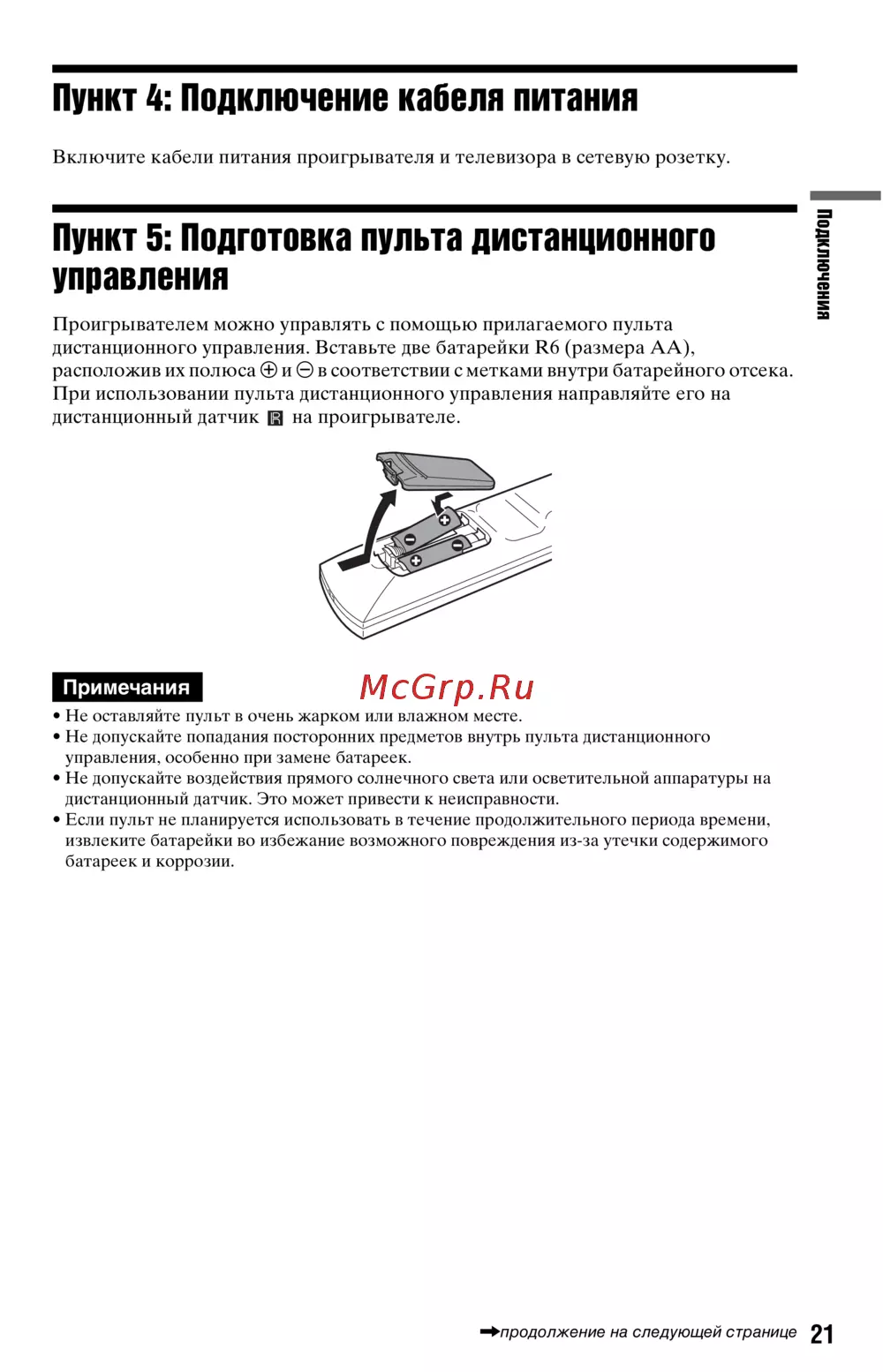 дистанционного управления. Вставьте две батарейки R6 (размера AA),