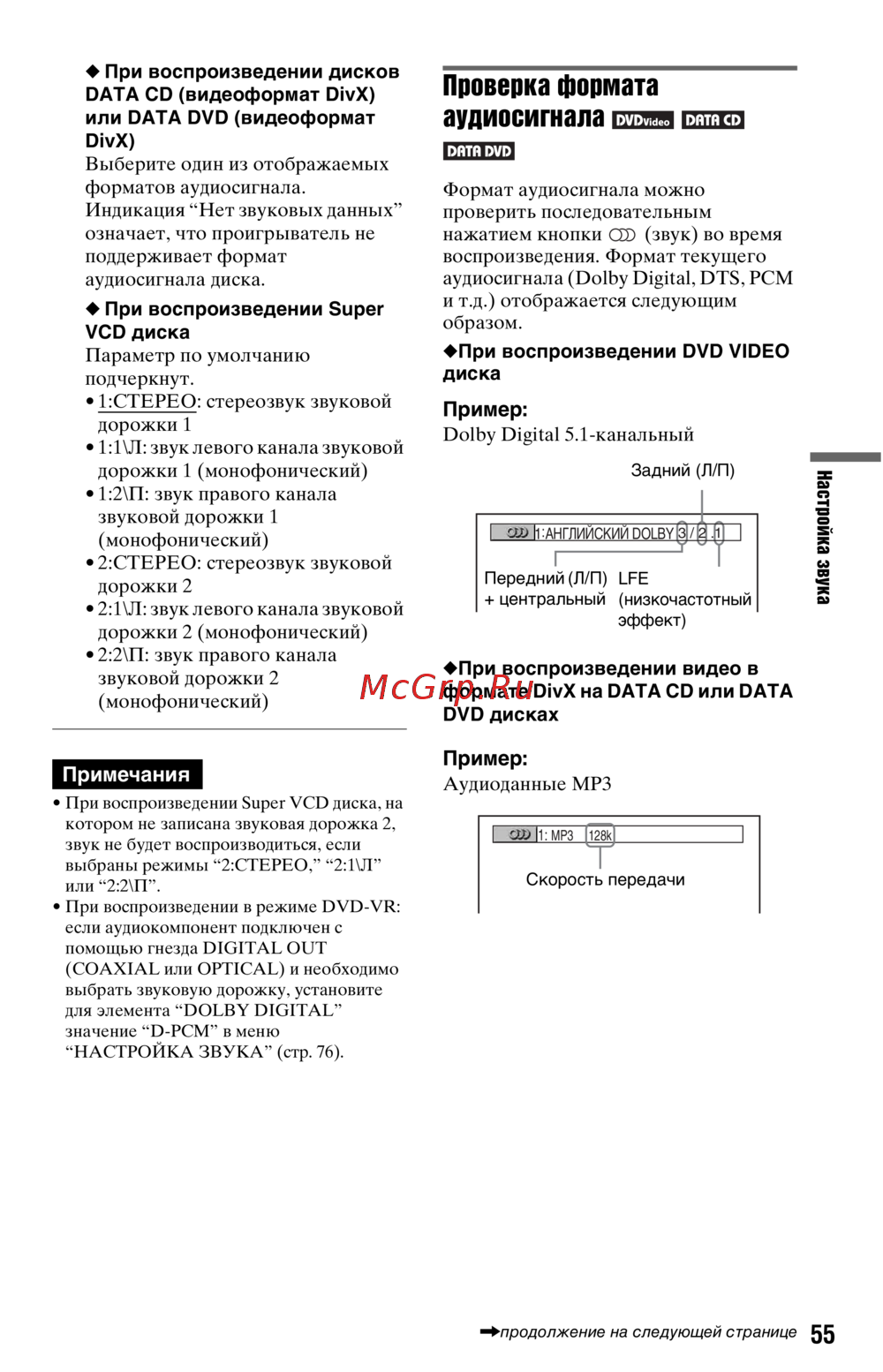 - Установка приоритета для звуковой дорожки содержащей максимальное число каналов при воспроизведении dvd video диска на котором звук записан в нескольких звуковых форматах pcm аудиоданные mpeg dts или dolby digital p.74