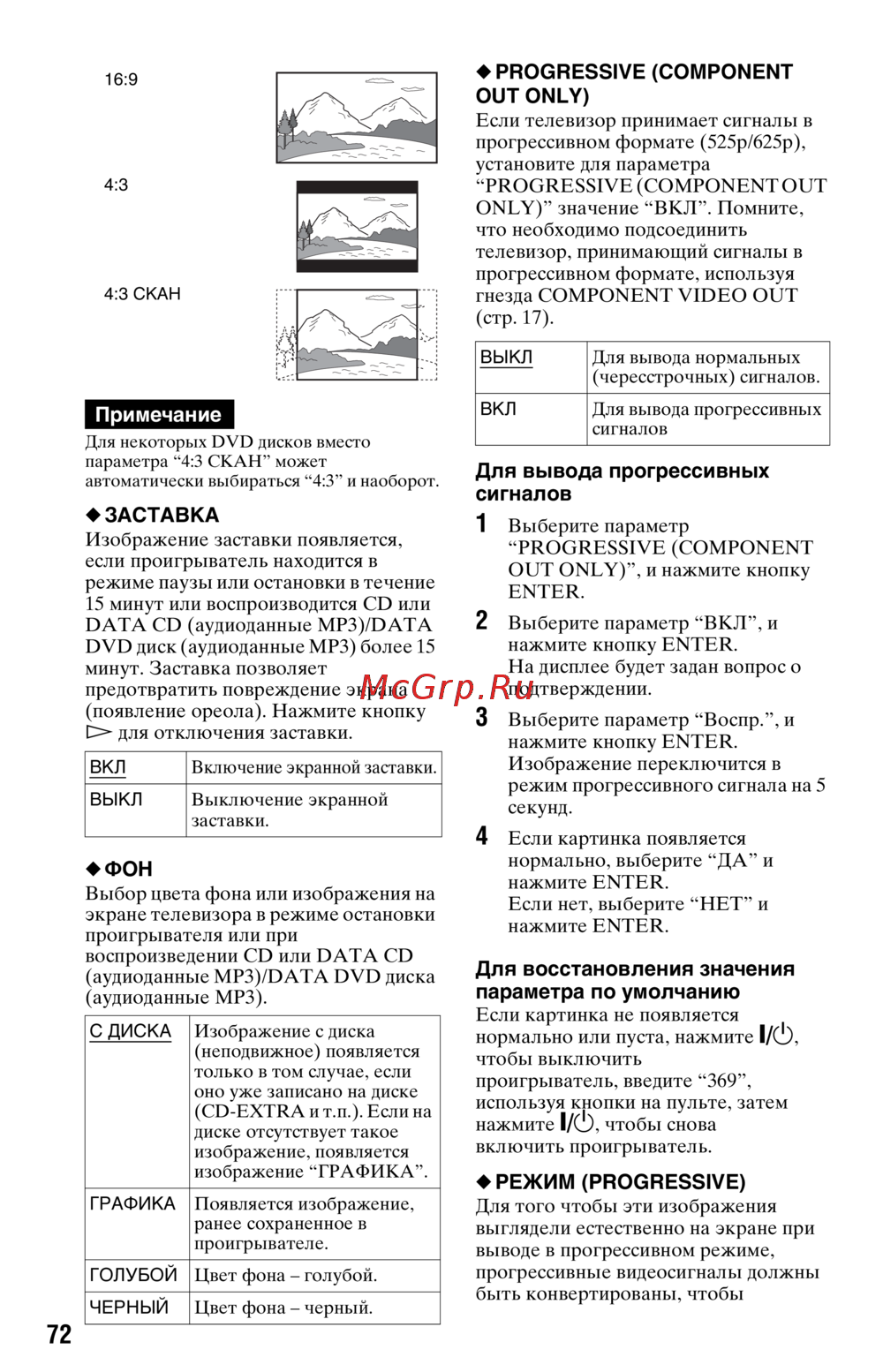 Sony DVP-K68 — настройки проигрывателя: заставка, фон и прогрессивный режим [72/88]