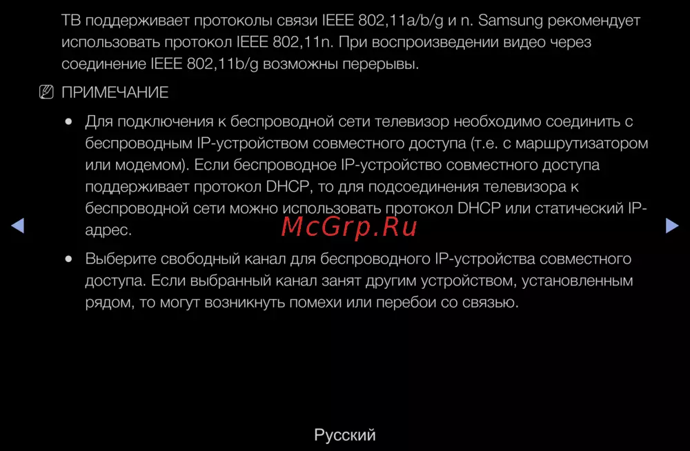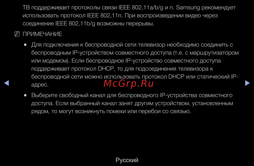 ТВ поддерживает протоколы связи IEEE 802,11a/b/g и n. Samsung рекомендует
