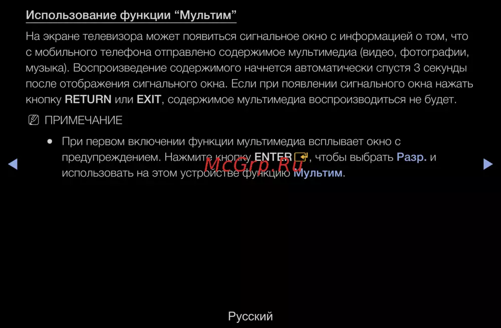 кнопку RETURN или EXIT, содержимое мультимедиа воспроизводиться не будет.