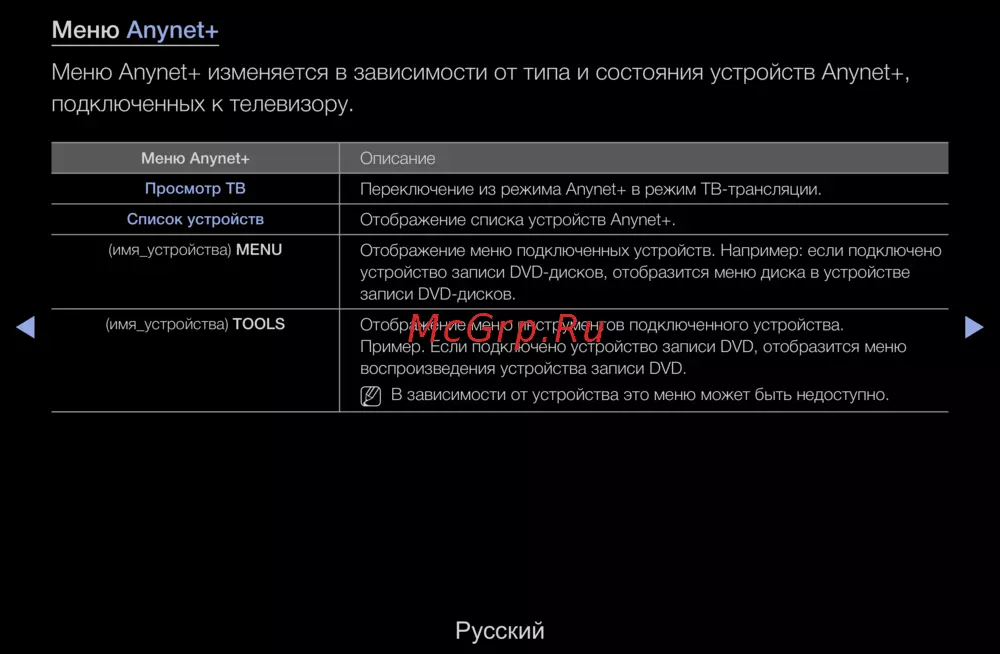 Меню Anynet+ изменяется в зависимости от типа и состояния устройств Anynet+,