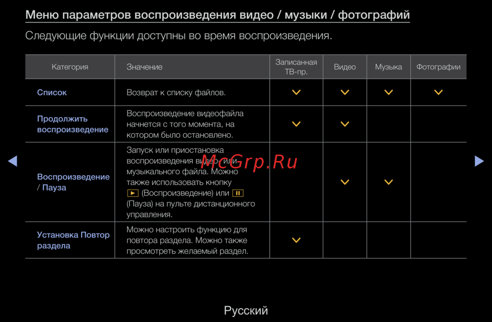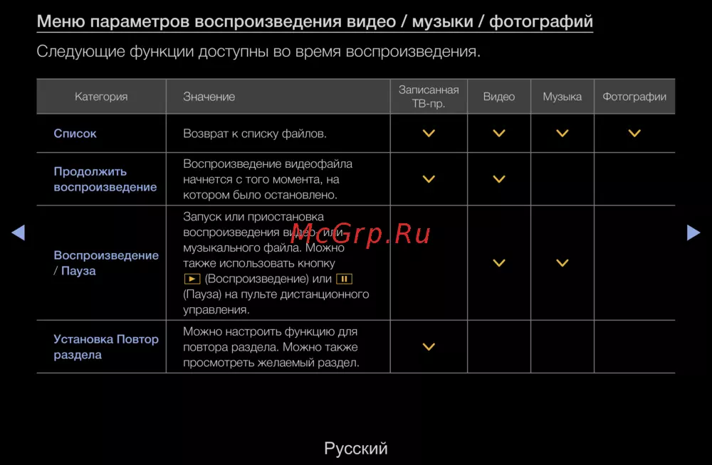 Изучите доступные функции воспроизведения видео, музыки и фотографий. Узнайте, как управлять воспроизведением, устанавливать повторы и возвращаться к списку файлов.