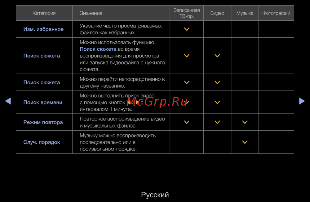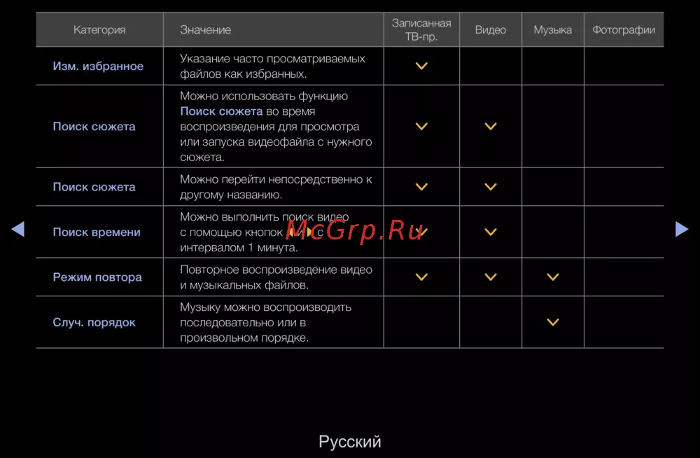 Изучите функции поиска сюжета, режима повтора и случайного порядка воспроизведения для удобного просмотра видео и прослушивания музыки.