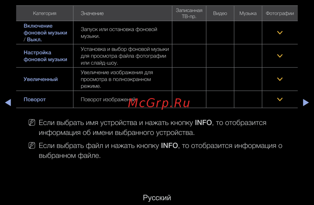 Если выбрать файл и нажать кнопку INFO, то отобразится информация о