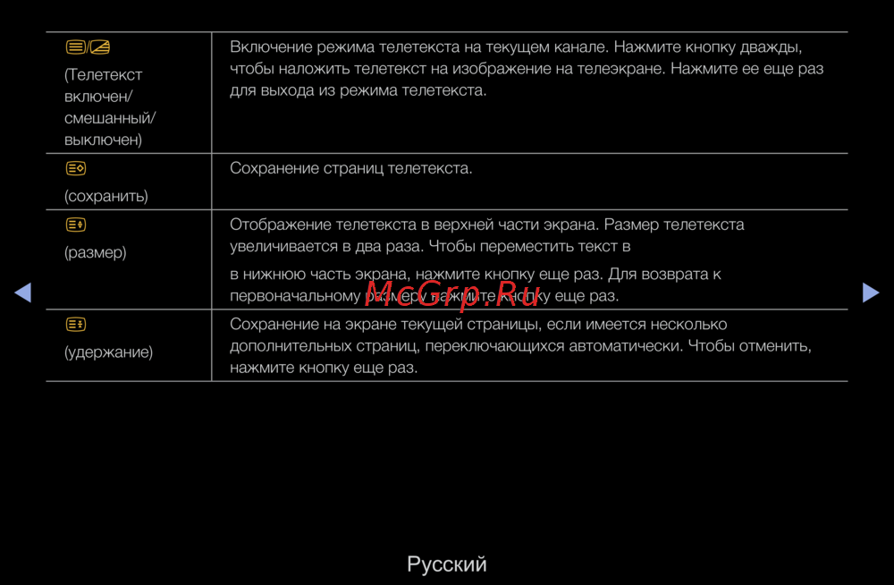 Включение режима телетекста на текущем канале. Нажмите кнопку дважды,