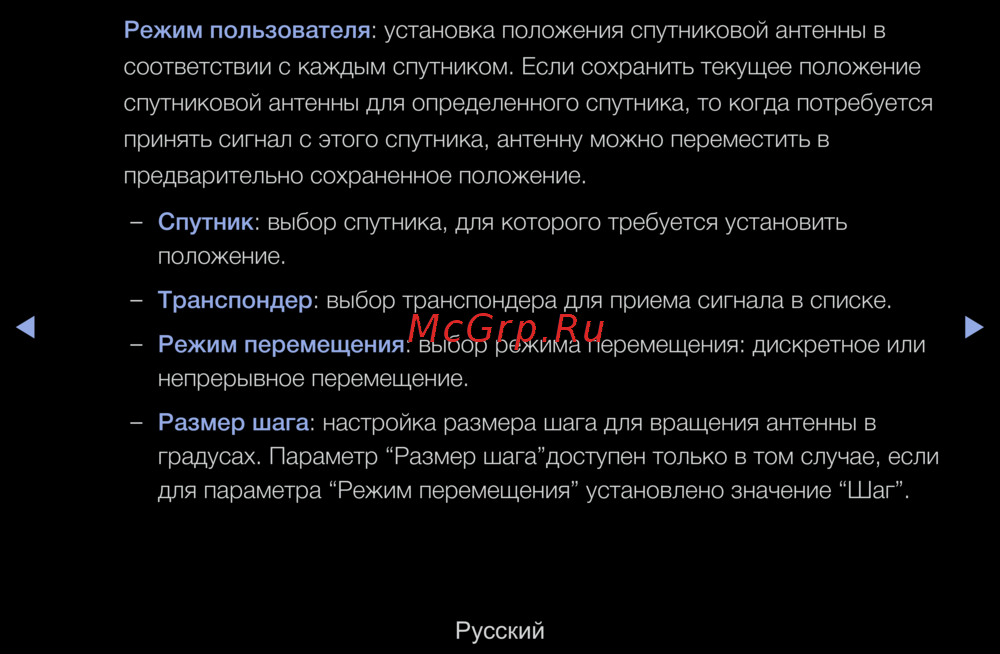 Режим пользователя: установка положения спутниковой антенны в
