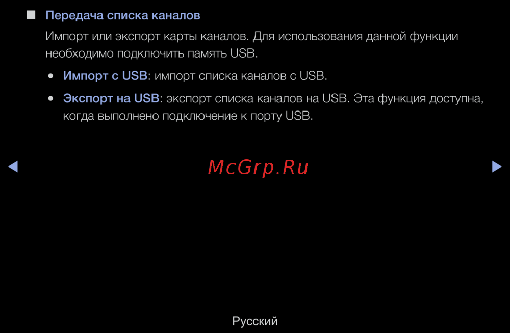 Экспорт на USB: экспорт списка каналов на USB. Эта функция доступна,