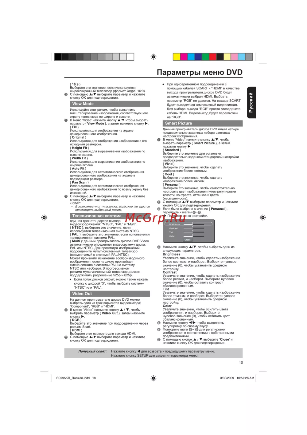 Инструкция по настройке параметров видео, аудио и цветовых режимов DVD-проигрывателя. Узнайте, как выбрать правильные настройки для вашего телевизора.