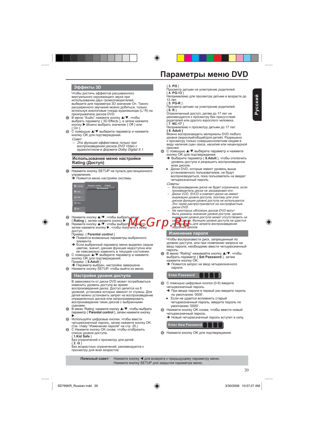 - Чтобы воспроизвести диск запрещенный по уровню доступа или при появлении запроса на ввод пароля необходимо ввести четырехзначный пароль p.21