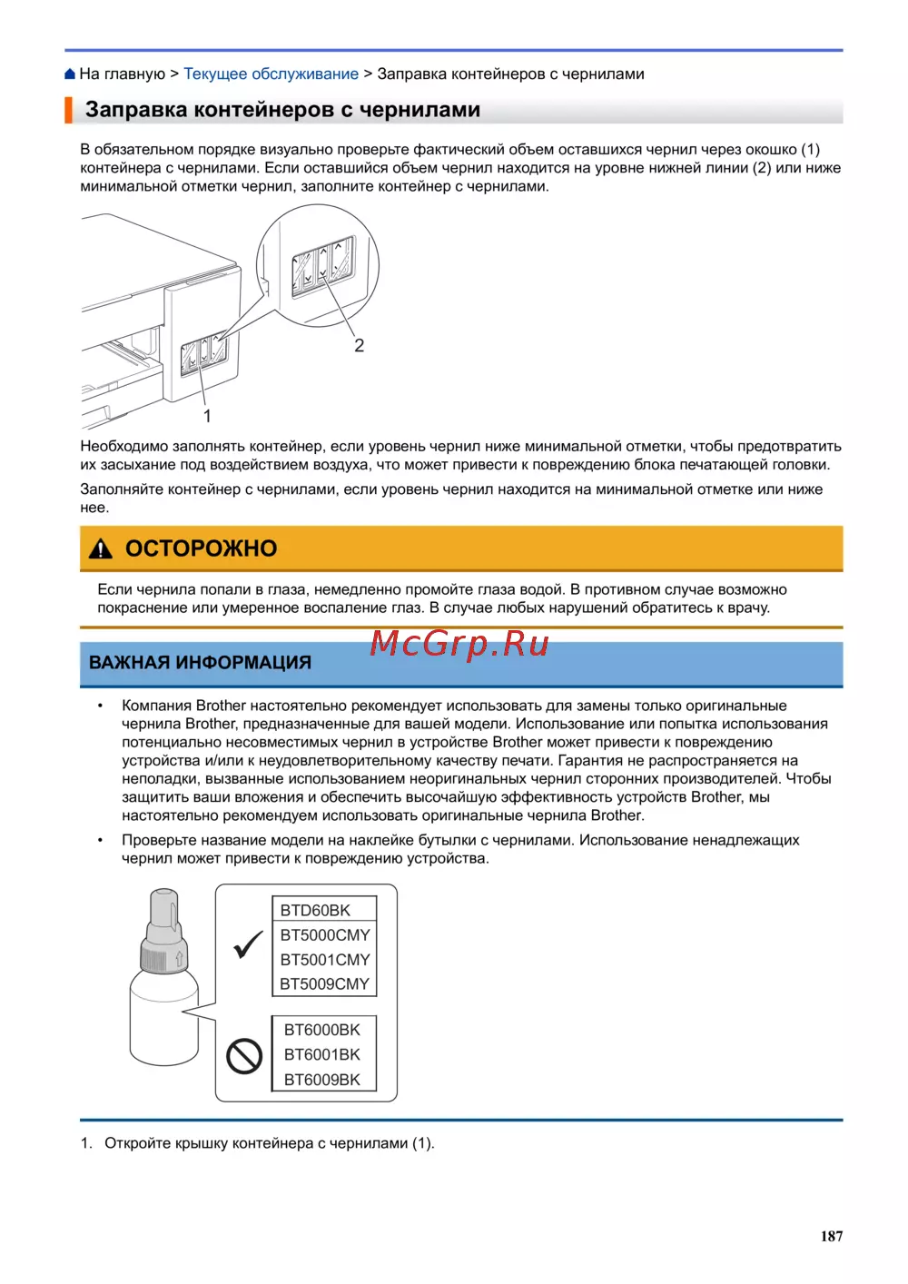 чернила Brother, предназначенные для вашей модели. Использование или попытка использования