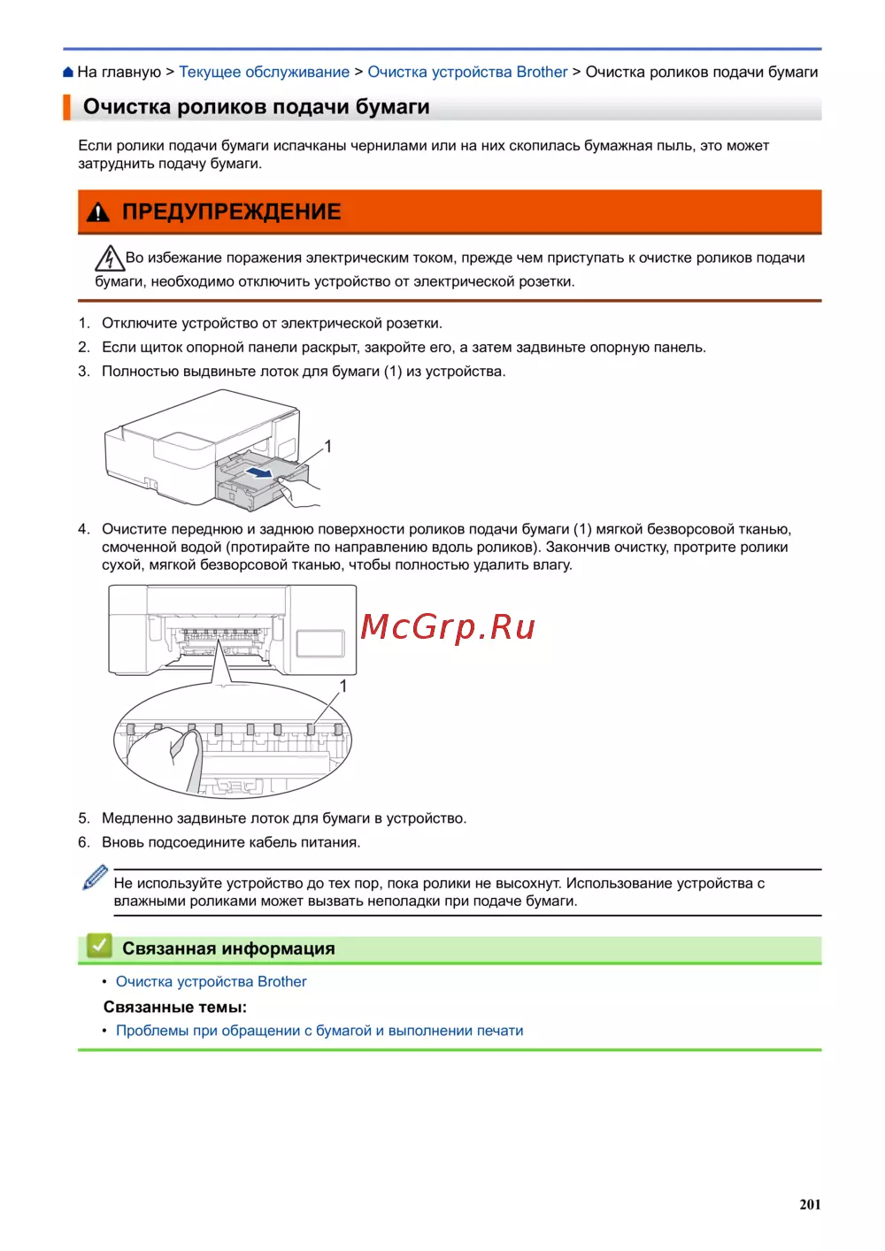 влажными роликами может вызвать неполадки при подаче бумаги.