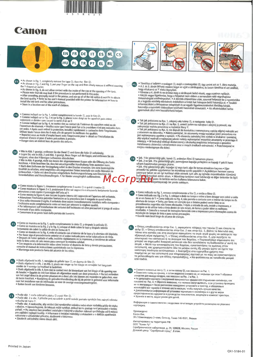 Canon NL CS фффффф As shown in Fig 1 completely remove the tape then the film ffh P olH el teljesen a szalagot Ф majd a csomagolást úgy amint azt az 1 ábra mutatja the Yshapedair outlet R9 3 pUt your fin9er on the caP and the sb ly remove it without covering L 2 àbran J m6d0n 1е9Уе az ujját a zárókupakra és lassan távolitsa el azt anélkül hogy eltakarná az Y alakü légnyilárt I Si n0 i I0 1 w th he inside 01 he cap or opening of the tank Please note that ink may leak il the procedure is not performed in this order rhe 9 n 11 he printer and use up all ol the ink within 6 months to obtain P 0V ded b he O 1 w rmation on how to mstalHho manUa install tne mk ink nnk tankxna c and for other precautions Store in a location out of the reach of children m ind quf sur la Fig 1 retirez complètement la bande CD puis le film Comme indique sur la Fig 2 et sur la Hg 3 placez votre doigt sur le capuchon puis retirez lentement ce dernier sans couvrir la sortie d air en Y ïS b 4 mC IK dCn au con a de nn é ieur du P retiré ou de e mdm 1 S lenOT P la P pas exécutée dans uXz îoutî ferom t ot ion installez rapidement la cartouche dans l imprimante utilisez toute I encre dans les 6 mois afin de garantir la meilleure des qualités T T a 4 aí á í nc é nbe me9 a a 6kupak belsó részet vagy a patron nyllását Kérjuk vegye figyelembe hogy a folyamat nem ebben a sorrendben való végrehajtása tmtaszivargast eredmenyezhet A tomités eltávolitása után azonnal helyezze be a nyomtatóba és a legjobb m noség elerésének érdekében a tintât hat hónapon belül hasznalja el További informaciokert a tmtapatron telepitését és az egyéb figyelmeztetéseket illetóleg kérjúk használja a nyomtató dobozában található használati útmutatót Az alkatrészeket tansa gyermekek altal nem hozzáférhetó helyen Л JaJ ь рокагэпо na Rys 1 zdejmi tala asm Ф a nastçpnie foil lak ak pokazano na Rys 21 na Rys 3 umiefc palen na nakrqtce i zdejmij ja powoll nie zakrywajqc wylotu powietrza w ksztakie tilery Y Tak jak pokazano na Rys 4 nie dopusc do kontaktu z wewngtczna czescia zdjetej nakretki ani Reportez vous au mode d emploi fourni avec l imprimante pour le détail sur l installation du réserve d encre et pour d autres précautions à prendre Ranger dans un endroit hors de portée des enfants Wie in Abb I gezeigt entfernen Sie das Band D und dann die Folie vollständig W legen Sj wie in Abb 2 und Abb 3 gezeigt Ihren Finger auf die Kappe und entfeinen Sie sie langsam ohne den Yfoimigcn luftauslass abzudecken Wie in Abb 4 gezeigt nicht das Innere der abgenommenen Kappe oder die Öffnung des Tanks d i b u wch9 ma f Handhabung Time austrelen kann bich Am F n Mi H T En v e9P u 9 sofa I de O ueker einsetzen Um stets bestmögliche md emp m alle Ärohrr T n PiKMlzlen Tinten innerhalb von sechs Monafcn zu D ilikw aelieferte Bedienungsanleitung zum Einsetzen des Tmtenbehalters undVorsKhtsmaBiegeln Für Kinder unzugänglich aufbewahren M wko Na y pamiçlai ie atramenty moga wyciekac jezeli procedura nie ЙЯ opisem Po otwarciu zainstaluj bez zwfoki w drukarce I pamrgtaj akos nû y Укогг а wszystkie atramenty w przeciqgu 6 W X ob u9 dosUf one z drukarka znajdziesz informaeje о sposoble S mstalowanla zbiormka z atramentem oraz о innych srodkach ostroinosci Przechowywaf w 1 miejscu medostçpnym dla daeci ydc 9 e ild4i gibl bandi ardmdan film tamamen ikann 9 bi parma mizi kapaRa yerle tirin ve караф Y jekllli hava nkram iicijini kapatmadan yava a qikann ta fO ddlRi gibl карафп l i veya tank aRzi ile temas etmekten kacimn Eder kTn Li SU ГТ 40 ekl cp s anh Y f biBr Agrldiktan hemen sonra kul andiäin zrtan Д У Й еу Л deL mekl5in al ay iindc murekkebin tümünü kullandiRm zdan emin о un Murekkep tankrnin nasrl takilacagi ve diäer önlemler ile ilolll bllgi almak i in yazici de blrllkte verilen kullamo kilavuzuna bakm Qocuklann ula amayacoöi bir yordo saktayin 9 Come mostea la figura 1 nmuovere completamente il nastro e quindi il nastro 9U 2 e 1 h 8 11 dit0 cappuccio e nmuoverlo lentamente facendo atSSL nZ attenztone a nonT coprire il passaggio dell ana ad Y fli Corao tdicado na Fig 1 remova completamente a fita e entáo o filme Come mosba la figura 4 non toccare la parte intema del cappuccio né l apertura del serbatolo U Pr x iura non é eseguHa in quest ordine UnTvoîïa rim l inchH c nSï M toro deve essere immedialamente installato nella stampante e mchiostro usato completamente entro ser mesi per ottenere la migliore qualité il mLTeXTÆ dCI SWba Oi dcl1 nCbm O i ab r P auzioni si prega di vedere Átami ínrnndéy vr 2 Si C l09 e do ampa e l em 0 3 ida 9 1 pe a 0 fllat l0 com 0 inlwi da amPa da abertum do Z indTenha íad a f por abertura do tanque favor em ateneo que o tlnteira pederá verter tinta se os a 0 l emJe uad Ms á reinada do selo instale a mpressora e oRU e se de utilizar toda a unta dentro de seis meses de forma a poder obter os melhores T 1 dC o nKÍdo tom a I PU u informales acerca da in tal x o do tanque de tinta e para outras pfecau óes Guardo num local long do alcance de crianzas Conservare in un posto fuorl dalla portata del bambini Q Como se muestra en la Fig 1 quite completamente la cinta y después la película t 2J18 fi9 1 C0ltM ue 01 ded bfe U 1 desPufc cl re a Icnnmero sin cubrir lentamente la salida de aire en forma de Y iixû Ï V хь о IM vla I a irresTa TO S w unobe vu6T ОТПМ Еж 2 Kai argv EIK 3 байте то ÓÓKTUXÓ crag aná O1 7 И rzuvéxeia aipacpécrrc то aiyä aiyä xwpig va каХифете Tnv с аушуА аера ахАратод Y Опак unobeiKvútTai ornv Eut 4 pnv аууЦсте то H 4 tV e Z C a 10 on el lnlí c la pa y la abertura del depósito I feTro OesoXr hshLT ír 0 dcn indKad01 cvlta salpicaduras de tinta todbMmr T cl P lnstólcl rápidamente en la impresora y cerciórese de utilizar toda la tinta antes de seis meses para conseguir la máxima calidad rnnwurT 0 unoocl va mU T o o 